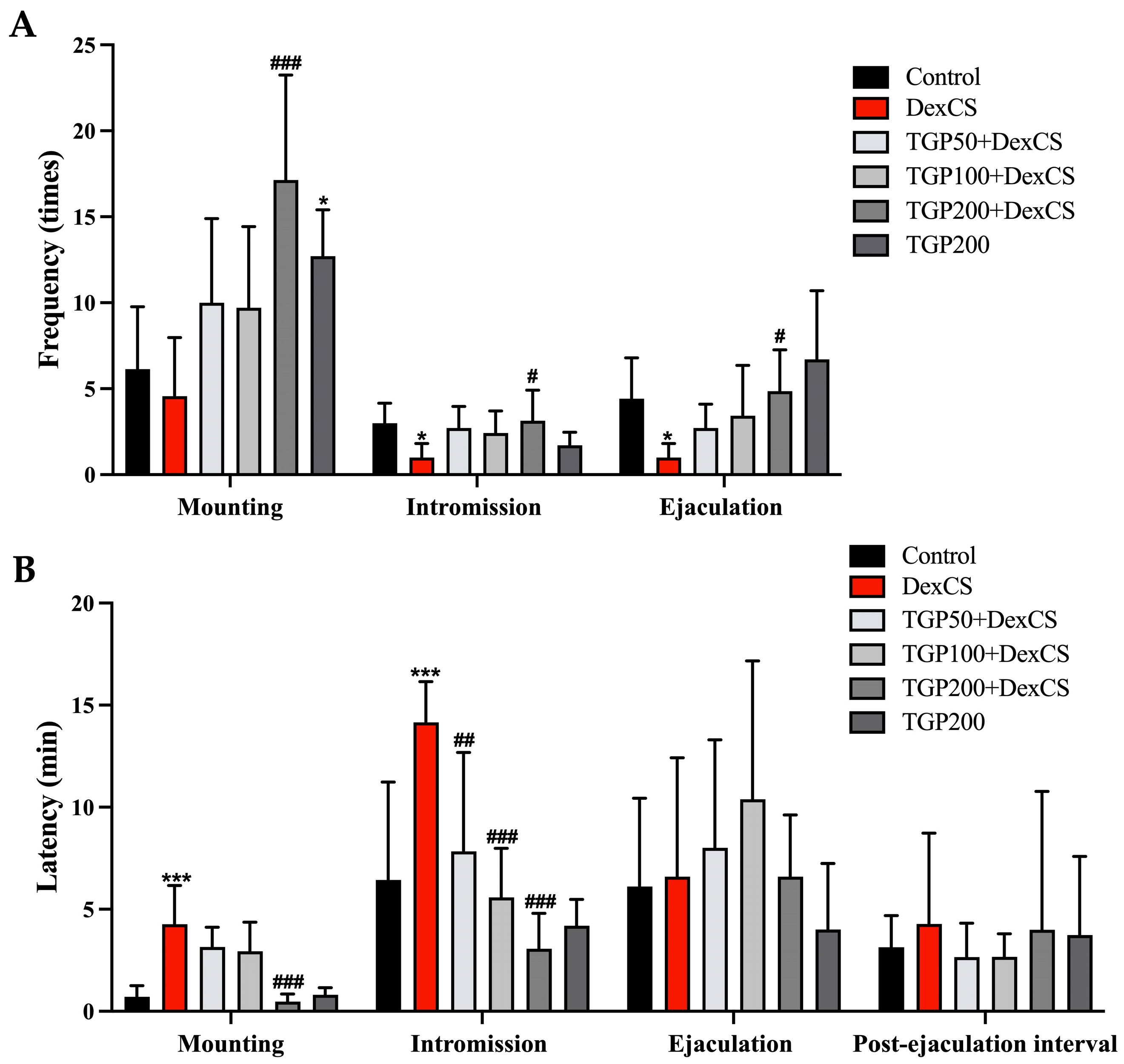3.4. Effect of TGP Recipe Extract on Enhanced Male Sexual Behaviors in DexCS-Treated Mice