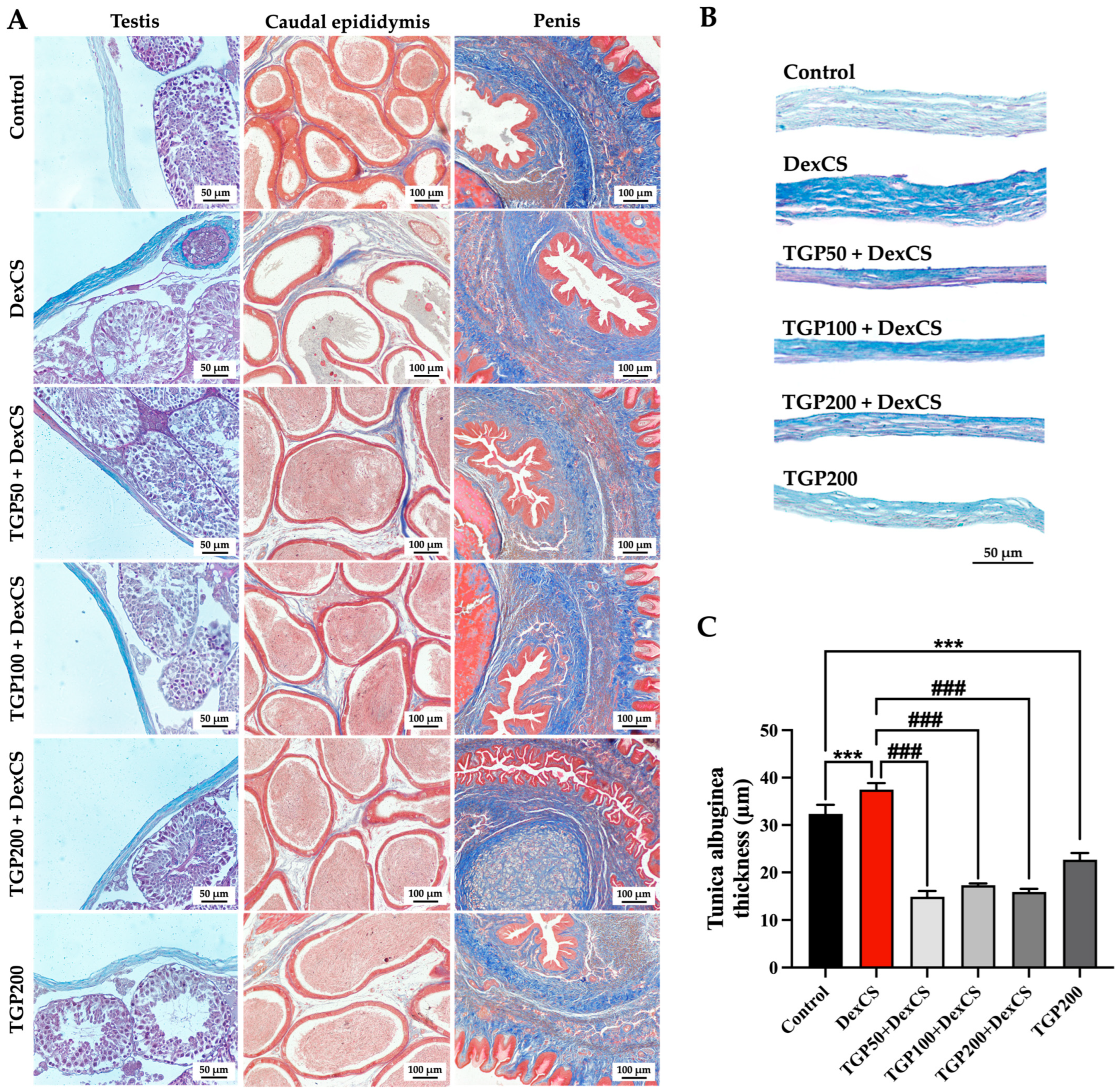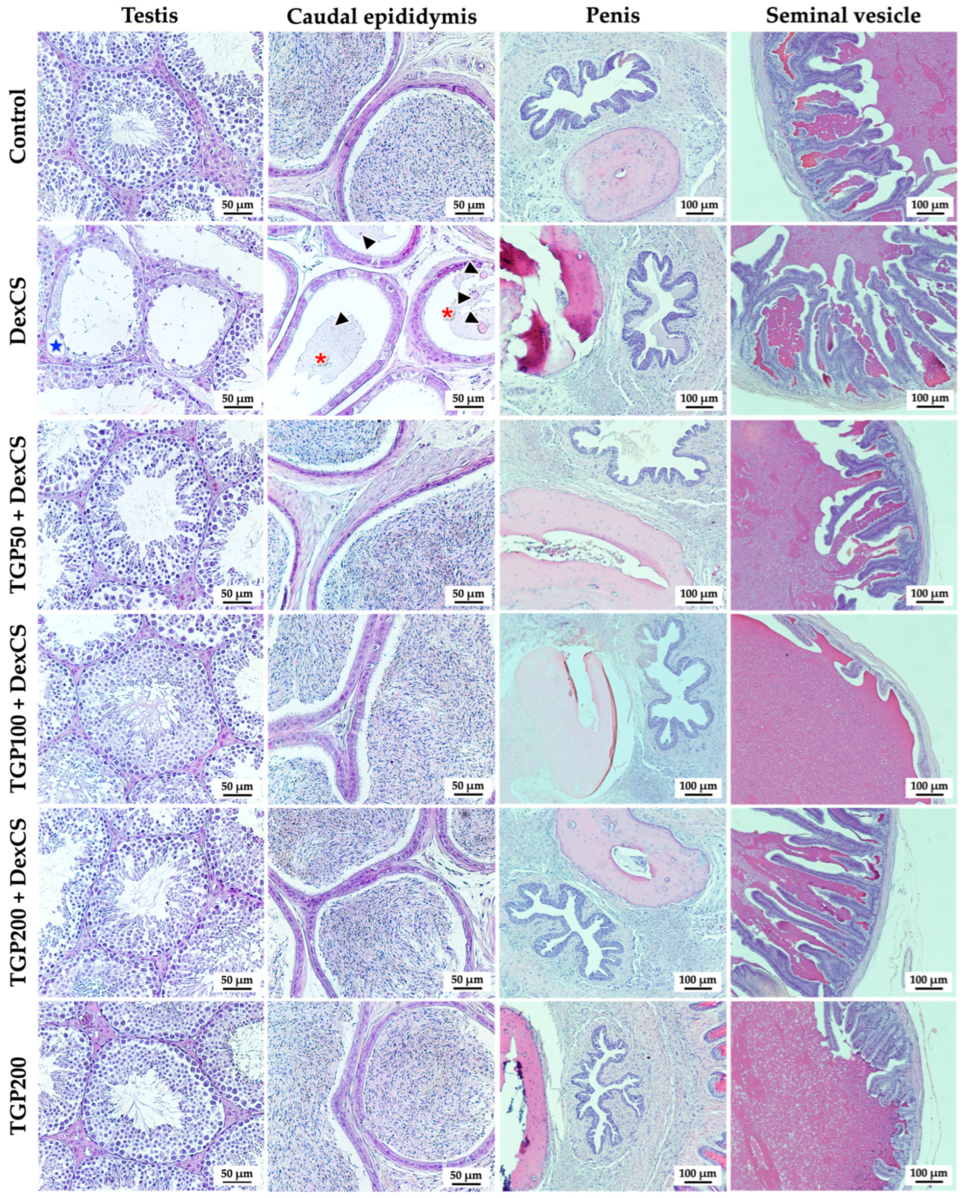 3.6. Effect of TGP Recipe Extract on Histology of Mouse Testis, Caudal Epididymis, Penis, and Seminal Vesicle in DexCS-Treated Mice