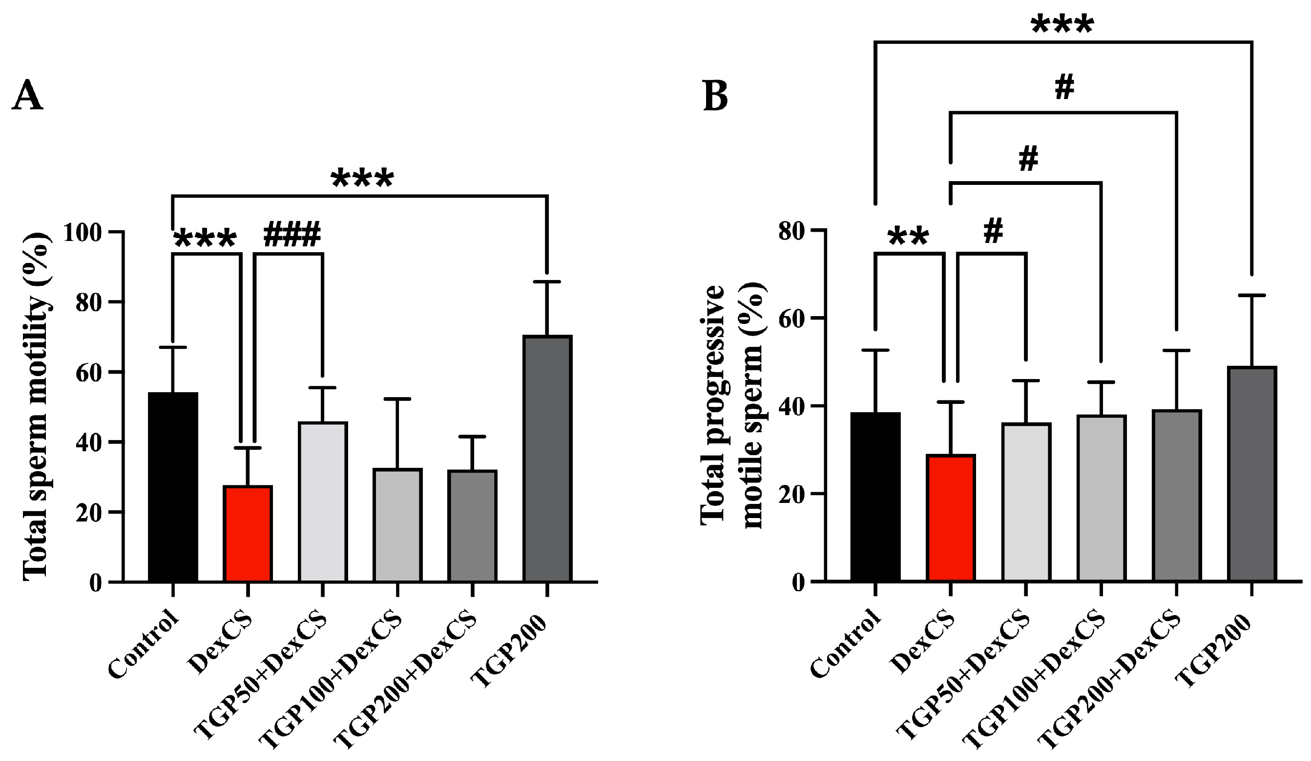 3.7. TGP Recipe Extract Improved Sperm Quality and Diameter and Epithelial Height of Seminiferous Tubule in DexCS-Treated Mice
