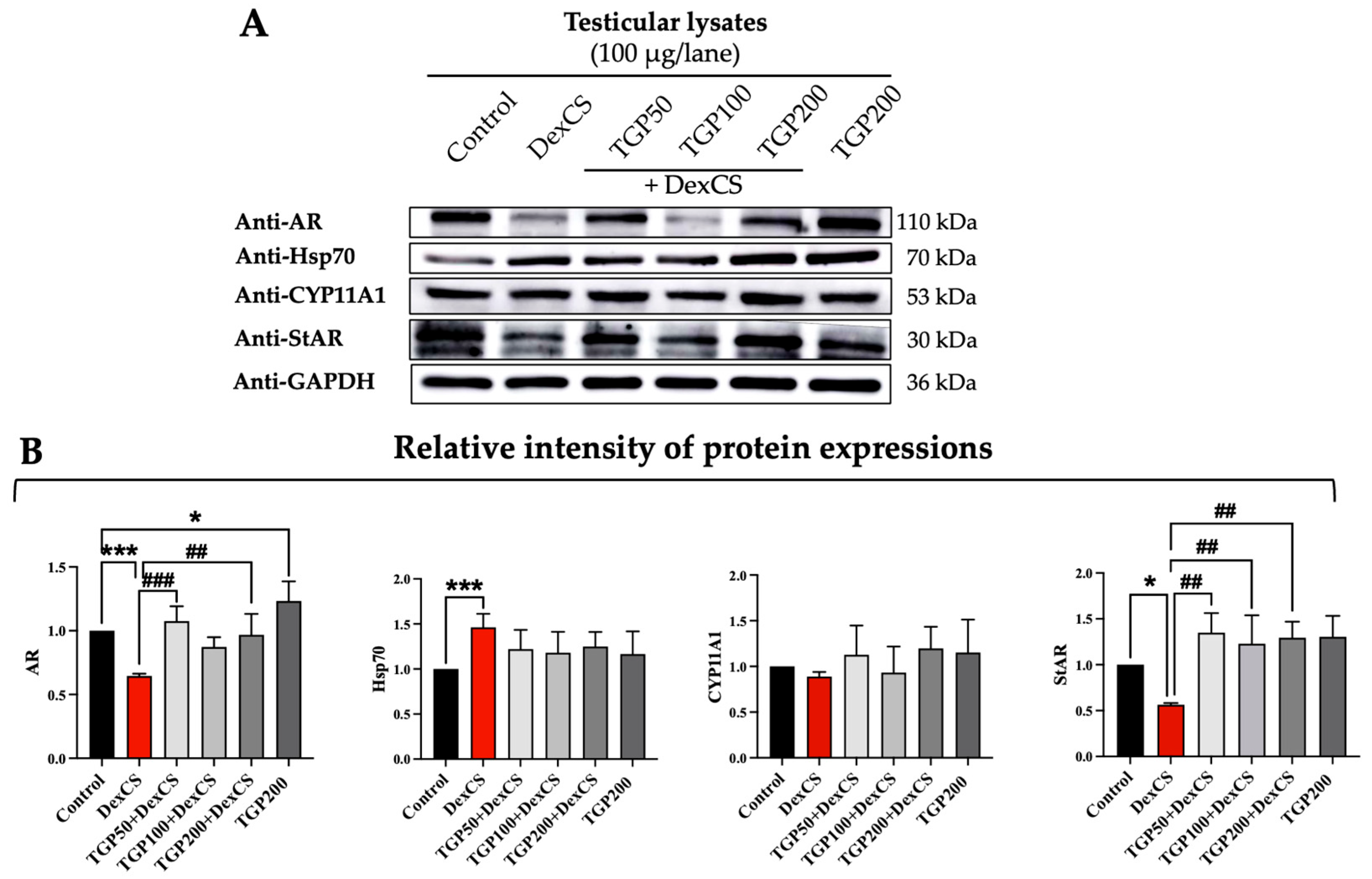 3.8. Effect of TGP Recipe Extract on the Testicular TyrPho Protein Expressions in DexCS-Treated Mice