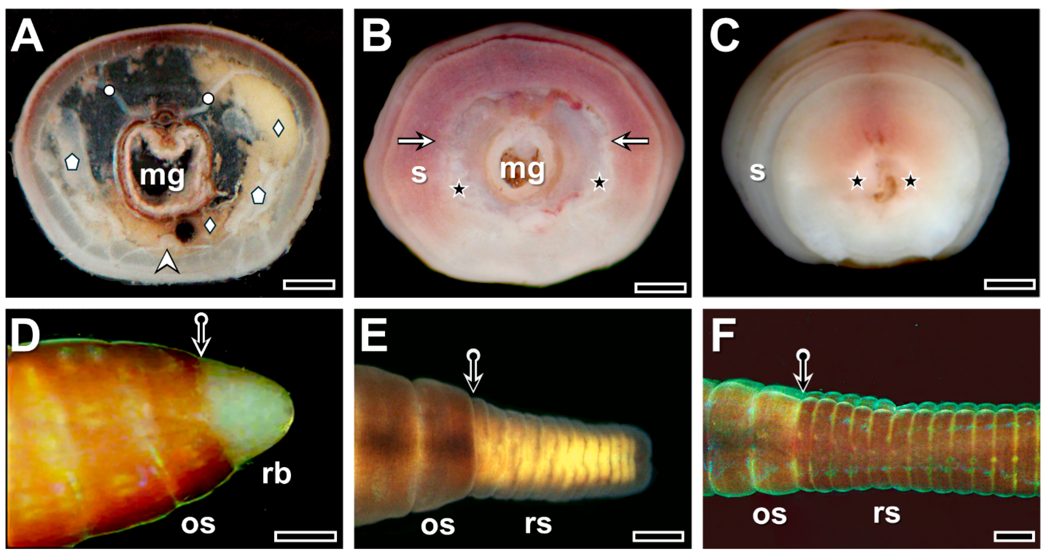 Figure 1. Anatomical characteristics of the transected segment of E. andrei from the surgical intervention (A), through the 3rd (B) and 6th (C) postoperative hours, and the formation of the regeneration blastema at the 1st postoperative week (D), as well as new segments at the 3rd (E) and 5th (F) postoperative weeks. Labeling: mg: midgut, arrowhead: ventral nerve cord, circle: dissepimental muscle, deltoid: coelomocytes, pentagon: metanephridium, asterisk: white tissue at the wound boundary, arrow: boundary of the transected body wall, bullet arrow: boundary of the original segments (os) and regeneration blastema (rb) or regenerating segments (rs). Scale bars: (AC): 250 μm, (DF): 500 μm.