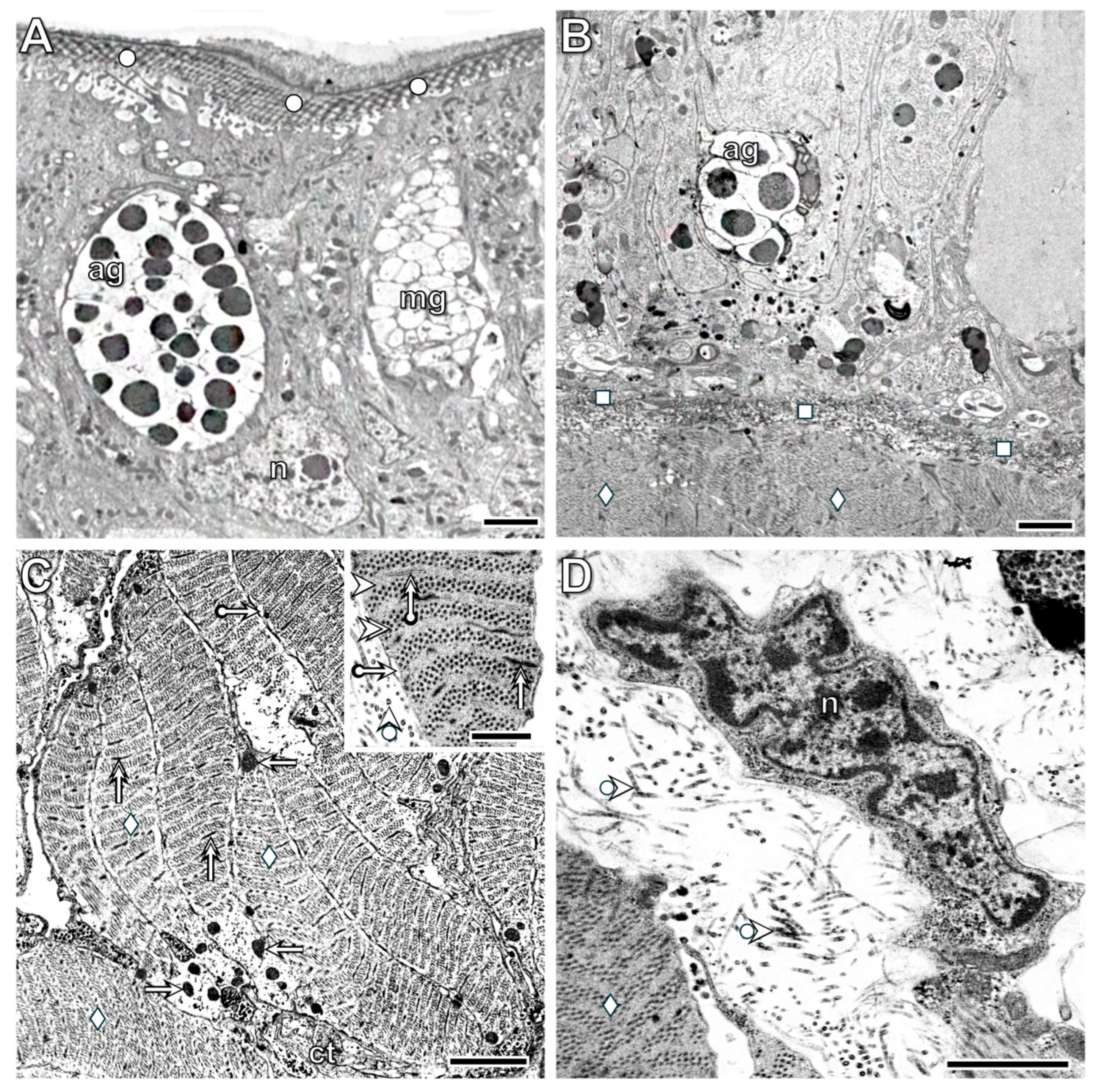 Figure 3. Distinct epithelial cell types are tightly attached to their neighbors, and no extended extracellular spaces are observed (A). The muscle fibers of both the circular (B) and longitudinal (C) muscle layers are surrounded by thin connective tissue containing some collagen fibers. Among muscle fibers, a few fibroblasts, surrounded by collagen fibrils, are present (D). Labeling: ag: albumen gland, ct: connective tissue, mg: mucous gland, n: nucleus, circle: cuticle, square: basement membrane, deltoid: muscle fiber, arrowhead: I-band, double arrowhead: A-band, arrow: mitochondrion, bullet arrowhead: collagen fibril, bullet arrow: peripheral zone of the sarcoplasmic reticulum, double bullet arrow: tubular element of the sarcoplasmic reticulum, double arrow: Z-rod. Scale bars: (AC): 2 μm, insert of (C): 500 nm, (D): 1 μm.