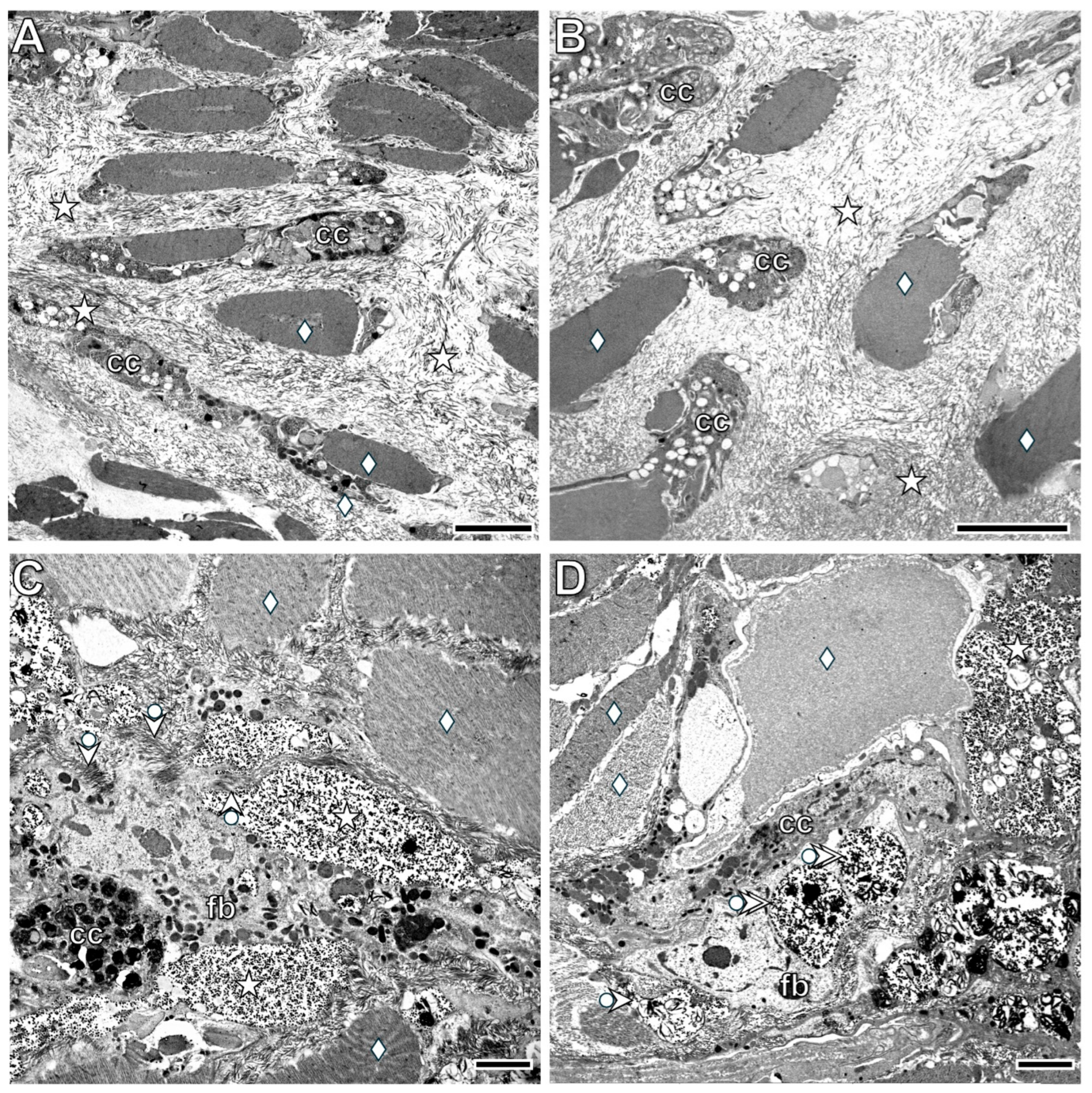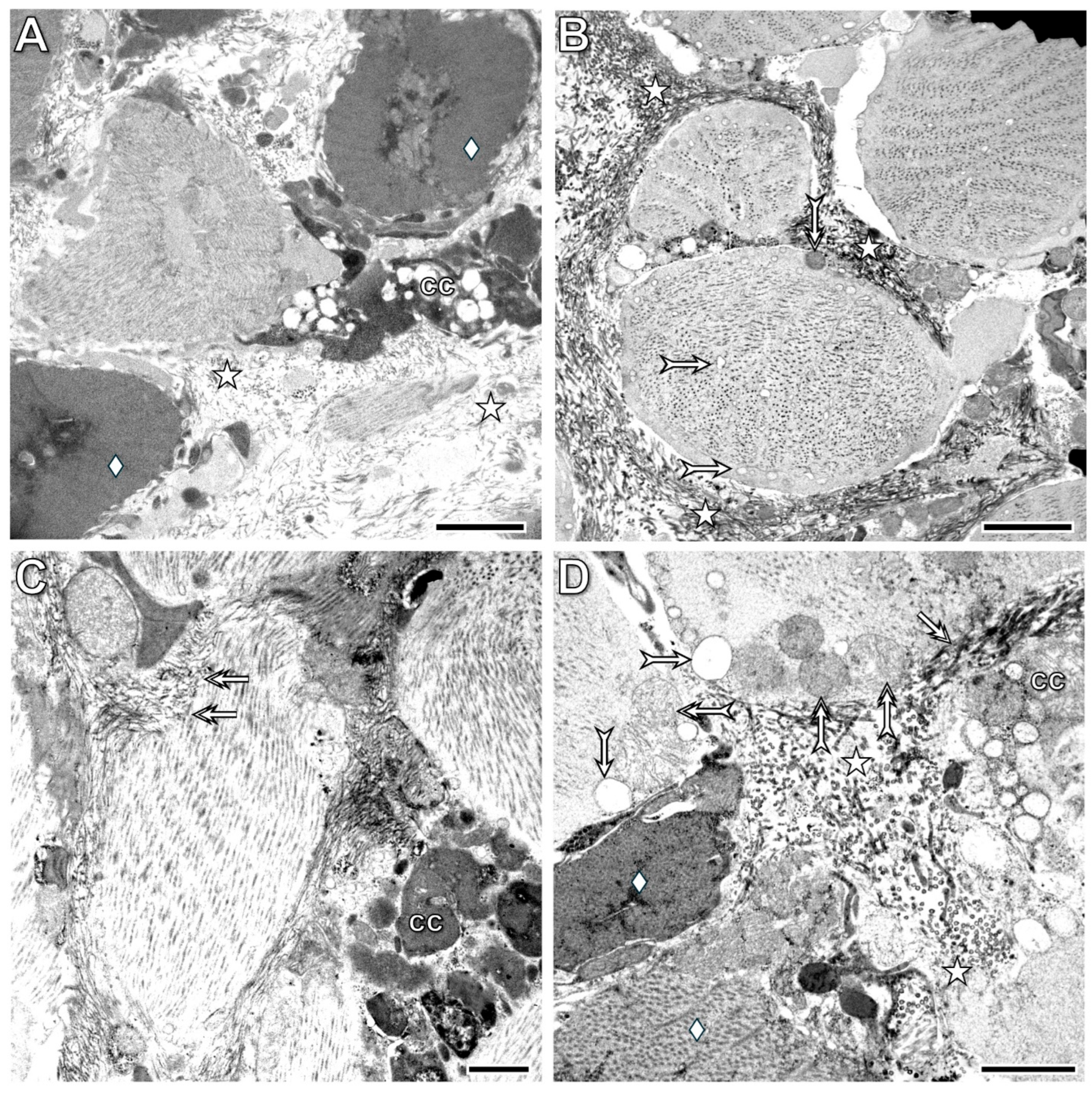 Figure 13. Ultrastructural characteristics of the muscle layer in the original parts of the transected body wall located in the farther (A) and in the nearer part (B) of the segment to the transection at the 1st postoperative week. Note that among the dark muscle fibers, extended extracellular spaces densely packed with collagen are observed. In the nearer part of the segment, even more extensive extracellular spaces are present between the muscle fibers. The intimate connection between coelomocytes and muscle fibers indicates communication between them. In distinct regions of the muscle layers, a high number of fibroblasts, characterized by extremely intense collagen production, are found (C,D). Their morphological characteristics are similar to those of vertebrate fibroblasts. Labeling: cc: coelomocyte, fb: fibroblast, deltoid: muscle fiber, asterisk: collagen deposition in the extracellular spaces, bullet arrowhead: exocytosed collagen fibrils, double bullet arrowhead: intracellular accumulation of collagen fibrils. Scale bars: (A,B): 5 μm, (C,D): 2 μm.