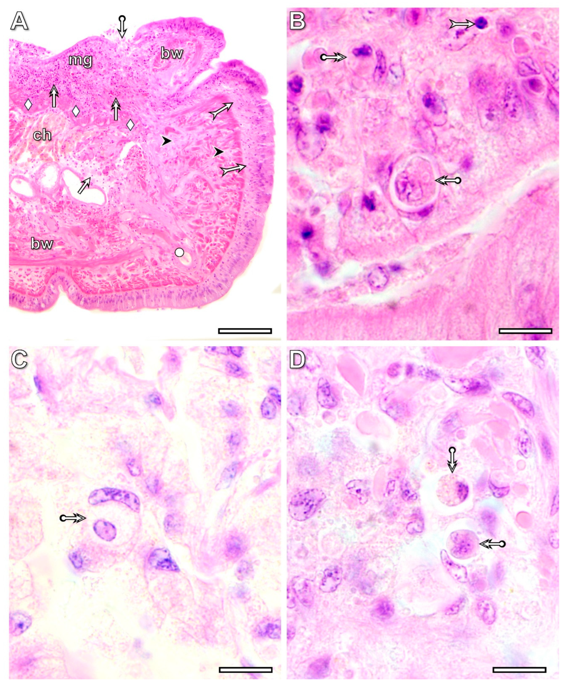 Figure 7. Low magnification (A) shows the fusion of the midgut and body wall tissues, as well as the accumulation of cells between the midgut muscle and epithelial layers by the 24th postoperative hour. High magnification (BD) reveals the heterogeneous morphology of the accumulated cells. Note the occurrence of distinct types of the cell-in-cell phenomenon within this cell mass. Labeling: bw: body wall, ch: chloragogenous tissue, mg: midgut, deltoid: muscle layers of the midgut, arrow: coelomocytes, double arrows: accumulated cells in the midgut wall, forked arrow: dedifferentiated epithelial cells, arrowhead: dedifferentiated muscle cells, bullet double arrow: cell-in-cell phenomenon, circle: chaete. Scale bars: (A): 100 μm, (BD): 10 μm.