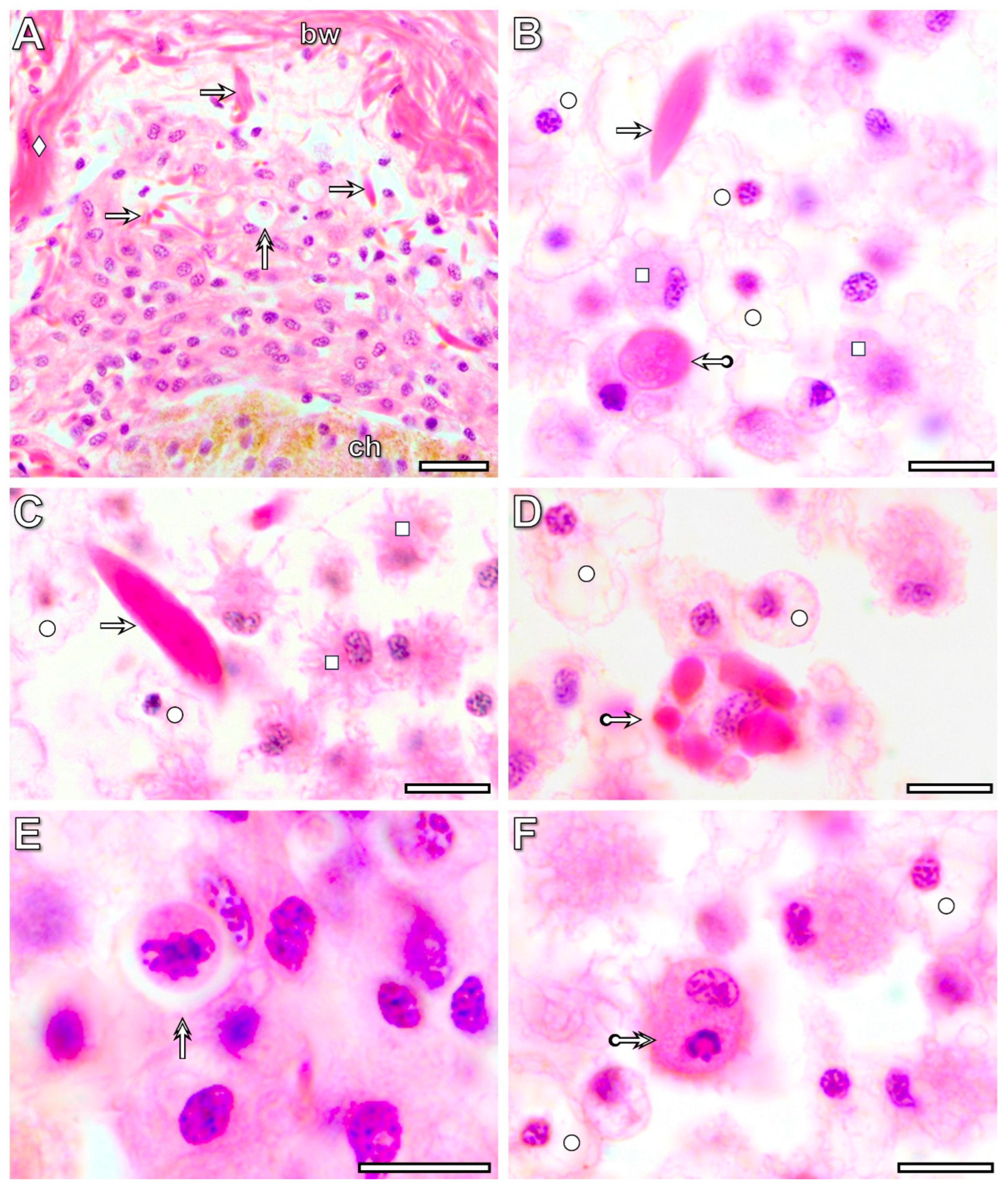 Figure 9. Light micrograph of coelomocytes accumulated in the intact segments located anterior to the transected segment of the regenerating E. andrei at the 3rd postoperative day (A). Note that the light microscopic characteristics of the coelomocytes differ from those of the dedifferentiated tissue cells that close the wound (see Figure 2, Figure 7 and Figure 8). Some amoebocytes engulf degenerating muscle fibers (BD) and, unexpectedly, some other coelomocytes as well (E,F). The fate of the engulfed cells can vary, as some appear normal (E), while others seem to be undergoing apoptosis (F). Labeling: bw: body wall, ch: chloragogenous tissue, arrow: muscle fibers, double arrow: cell-in-cell phenomenon, circle: eleocytes, square: amoebocyte, bullet arrow: engulfed muscle fibers in amoebocyte, deltoid: dissepiment. Scale bars: (A): 25 μm, (BF): 10 μm.