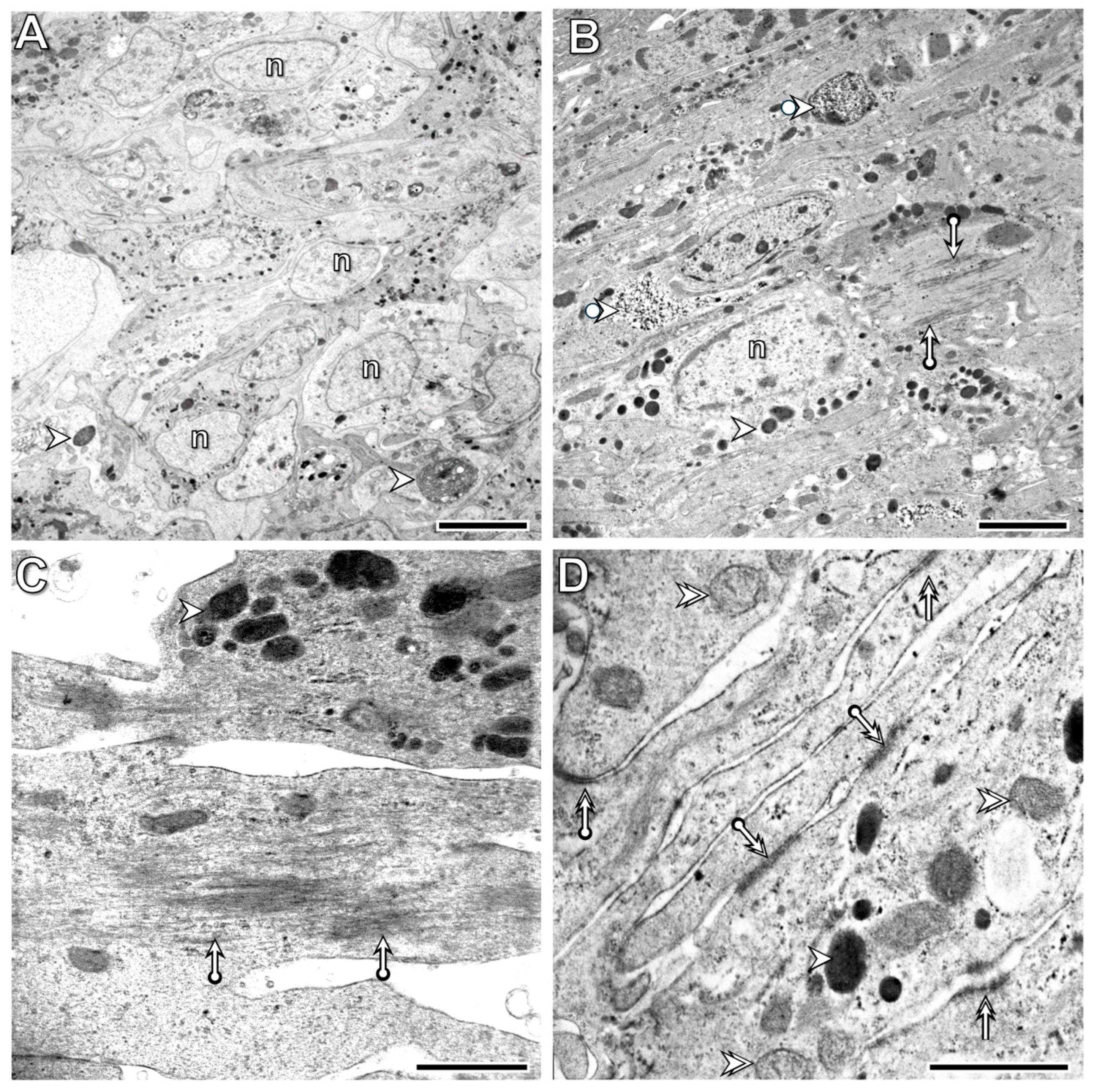 Electron microscopic examinations of the original parts of the transected segment supported the light microscopic results. Dark muscle fibers were present in both the circular and longitudinal muscle layers; they were densely packed in the farther part of the segment and sparsely packed in the region closer to the transection. Extended extracellular spaces filled with collagen fibers were located between the muscle fibers, showing close association with immigrating coelomocytes (Figure 13A,B). In distinct regions of the muscle layers, a high number of fibroblasts—characterized by extremely intense collagen production—were found (Figure 13C,D). Their morphological characteristics resembled those of vertebrate fibroblasts.