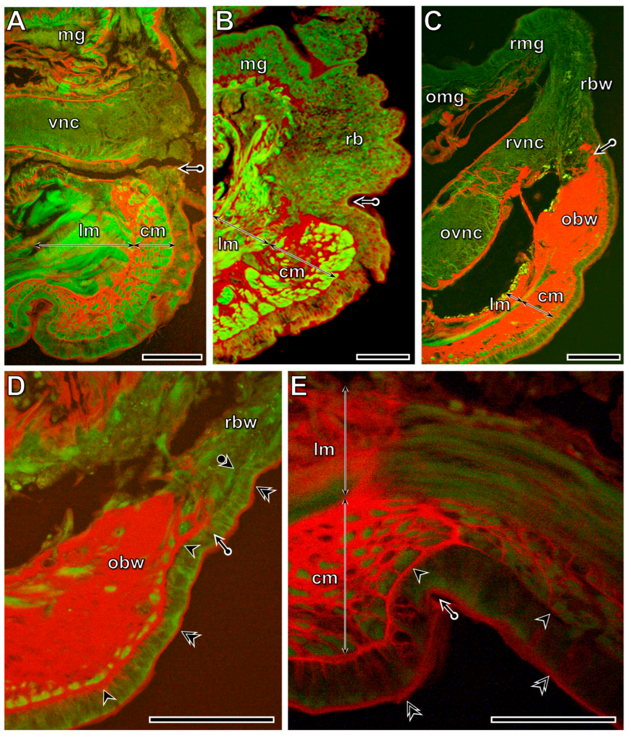 Figure 11. Distribution pattern of collagen deposition (red staining) in tissues of freshly operated (A) and regenerating specimens of E. andrei at the 1st postoperative day (B), 1st postoperative week (C,D), and 5th postoperative week (E). In freshly operated specimens, as in the intact segment, some collagen bundles are located around the muscle fibers of the circular muscle layer. Reorganization of collagen fibers in the transected segment and the formation of collagen-free new tissue are characteristic features of regeneration. By the 5th postoperative week (E), the circular and longitudinal muscle layers can already be distinguished in the transected segment; however, significantly thicker collagen bundles surround the circular muscle fibers compared to the control. Moderate collagen deposition is also observed in the muscle layers and the basement membrane. Labeling: cm: circular muscles, lm: longitudinal muscles, mg: midgut, vnc: ventral nerve cord, obw: original body wall, rbw: regenerating body wall, omg: original midgut, rmg: regenerating midgut, ovnc: original ventral nerve cord, rvnc: regenerating ventral nerve cord, rb: regeneration blastema, bullet arrow: site of the transection, arrowhead: original basement membrane, double arrowhead: cuticle, bullet arrowhead: developing basement membrane. Scale bars: (AD): 100 μm, (E): 50 μm.