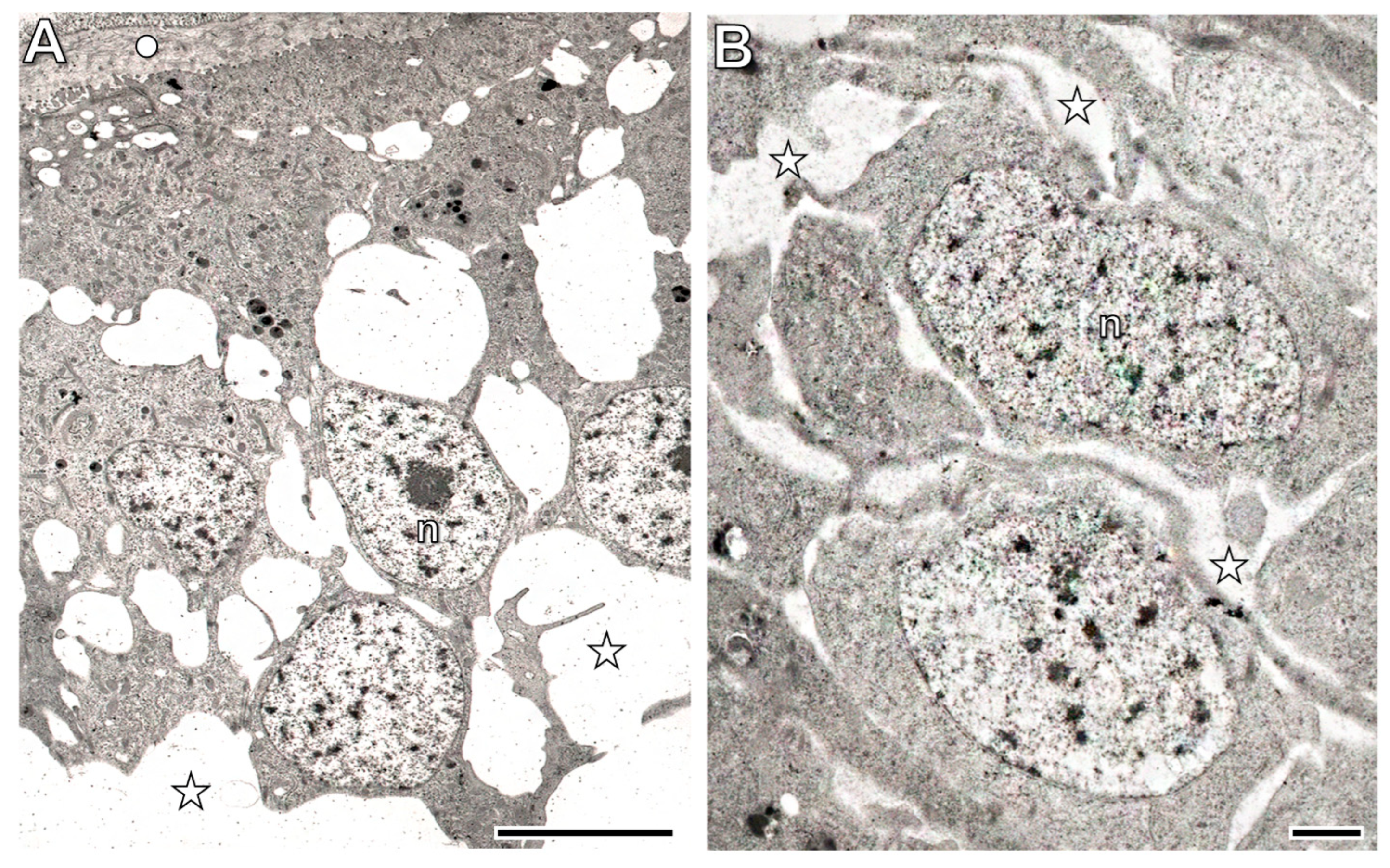 Figure 12. Ultrastructure of the prospective body wall in the regeneration blastema on the 1st postoperative week. Note that blast cells are present in both the prospective body wall epithelium (A) and muscle layers (B), and no collagen is observed in the extracellular spaces. Labeling: circle: cuticle, n: nucleus, asterisk: extracellular space. Scale bars: (A): 2 μm, (B): 1 μm.