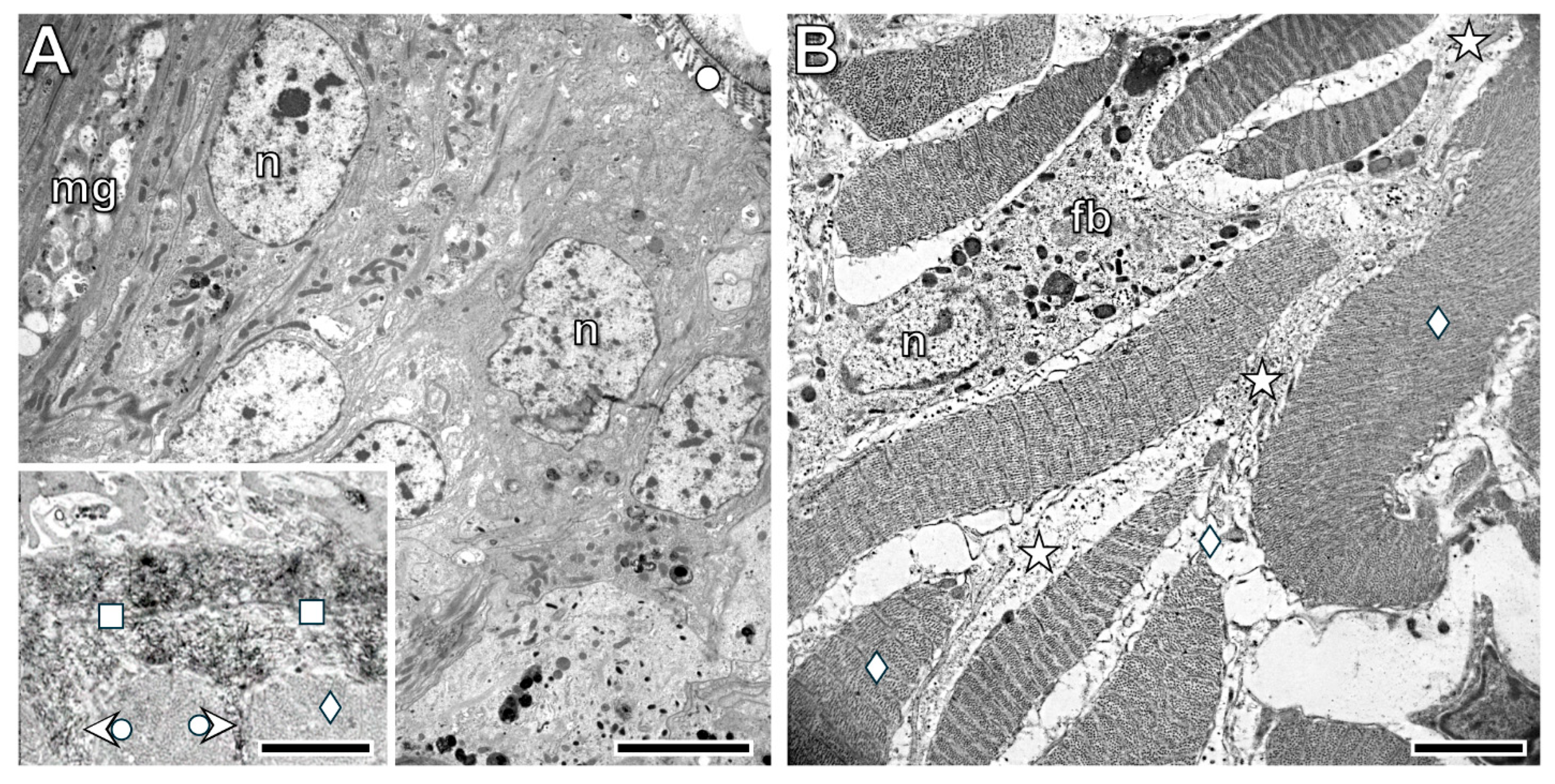 Figure 14. Ultrastructure of the regenerated body wall epithelium (A), circular muscles (insert (A)), and longitudinal muscle layer (B) at the 5th postoperative week. Note that the structure of the epithelium is similar to that of the control, with a collagen-rich cuticle and basement membrane being characteristic features. Some collagen deposition is also observed between the circular muscle fibers (insert (A)). In the longitudinal muscles, only weak collagen deposition is present; however, fibroblasts are already present between the muscle fibers. Labeling: fb: fibroblast, mg: mucous gland, n: nucleus, deltoid: muscle fiber, circle: cuticle, square: basement membrane, bullet arrowhead: collagen deposition between circular muscle fibers, asterisk: collagen deposition between longitudinal muscle fibers. Scale bars: (A): 5 μm, insert (A): 2 μm, (B): 2 μm.