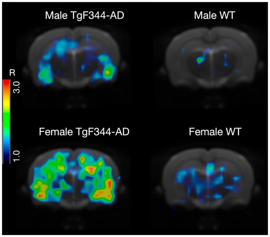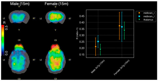 When comparing a 15-month-old male and female 3xTg-AD mouse, both the scaled images and R values reveal a sex-related difference in activity concentration (