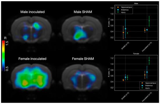 33]. The values obtained for the SHAM female animal were lower across all evaluated regions compared to the inoculated female rat. In the male rat, differences between the inoculated and SHAM animals were observed only at the injury site. As previously observed across other animal models, R values in inoculated male rats were lower than those in females.