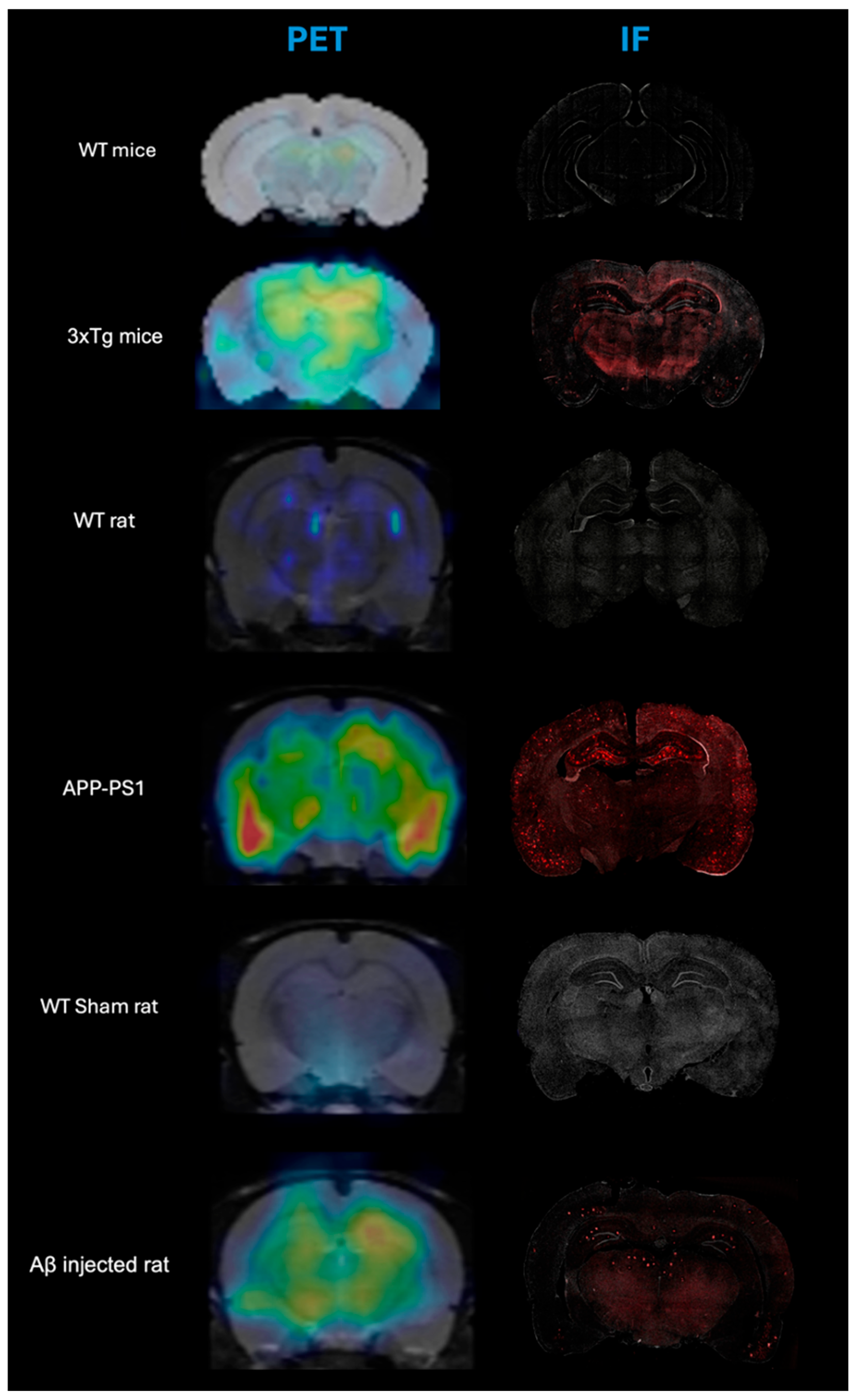 Illustrative comparison between microPET and Immunofluorescence images for the evaluated animal models and their controls are shown in