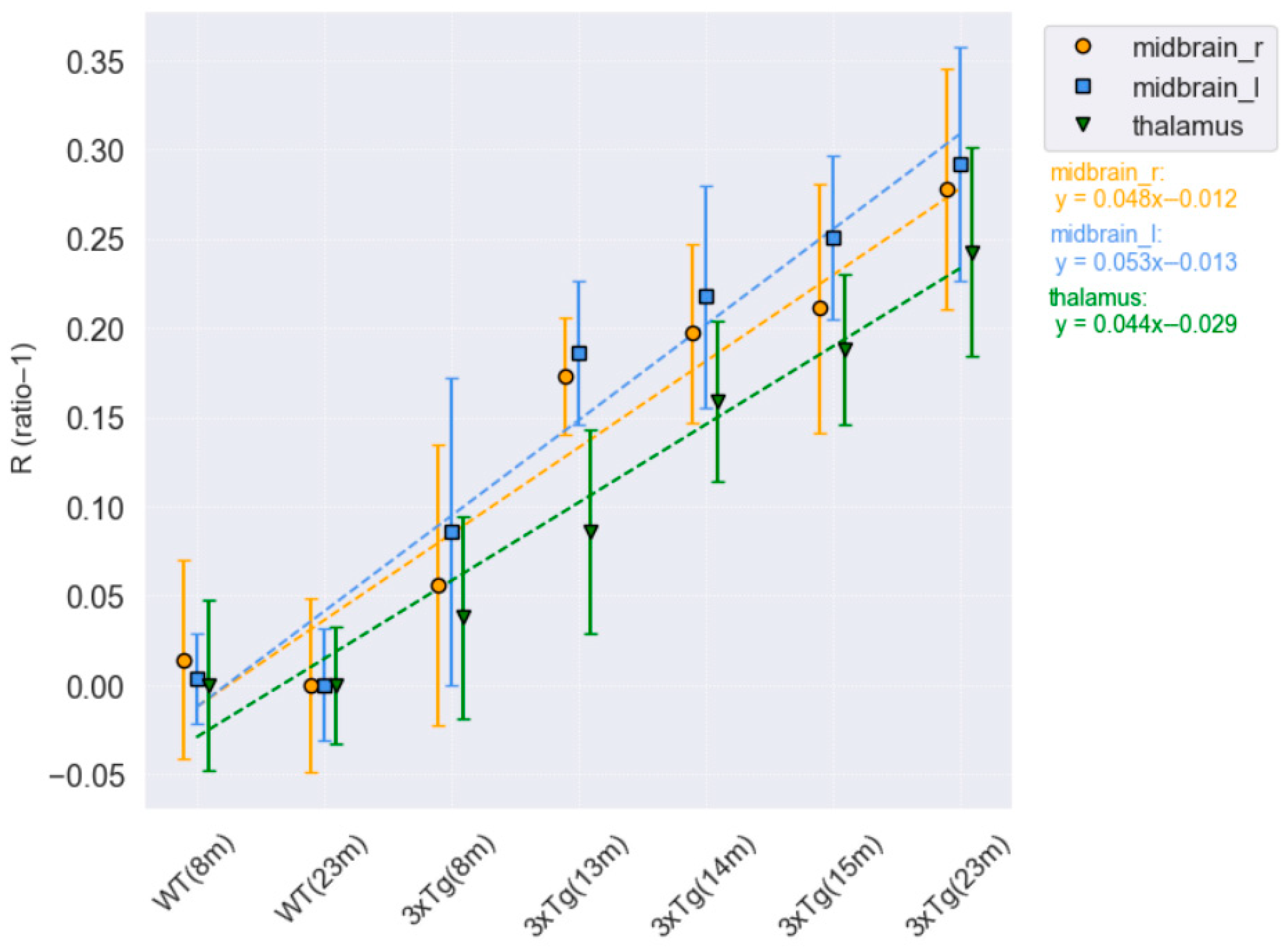 Figure 3. R values in the midbrain (right and left) and thalamus increased with age in 3xTg-AD mice, reaching their highest values in the oldest mouse evaluated (23 months): right midbrain (0.278), left midbrain (0.292), and thalamus (0.243).