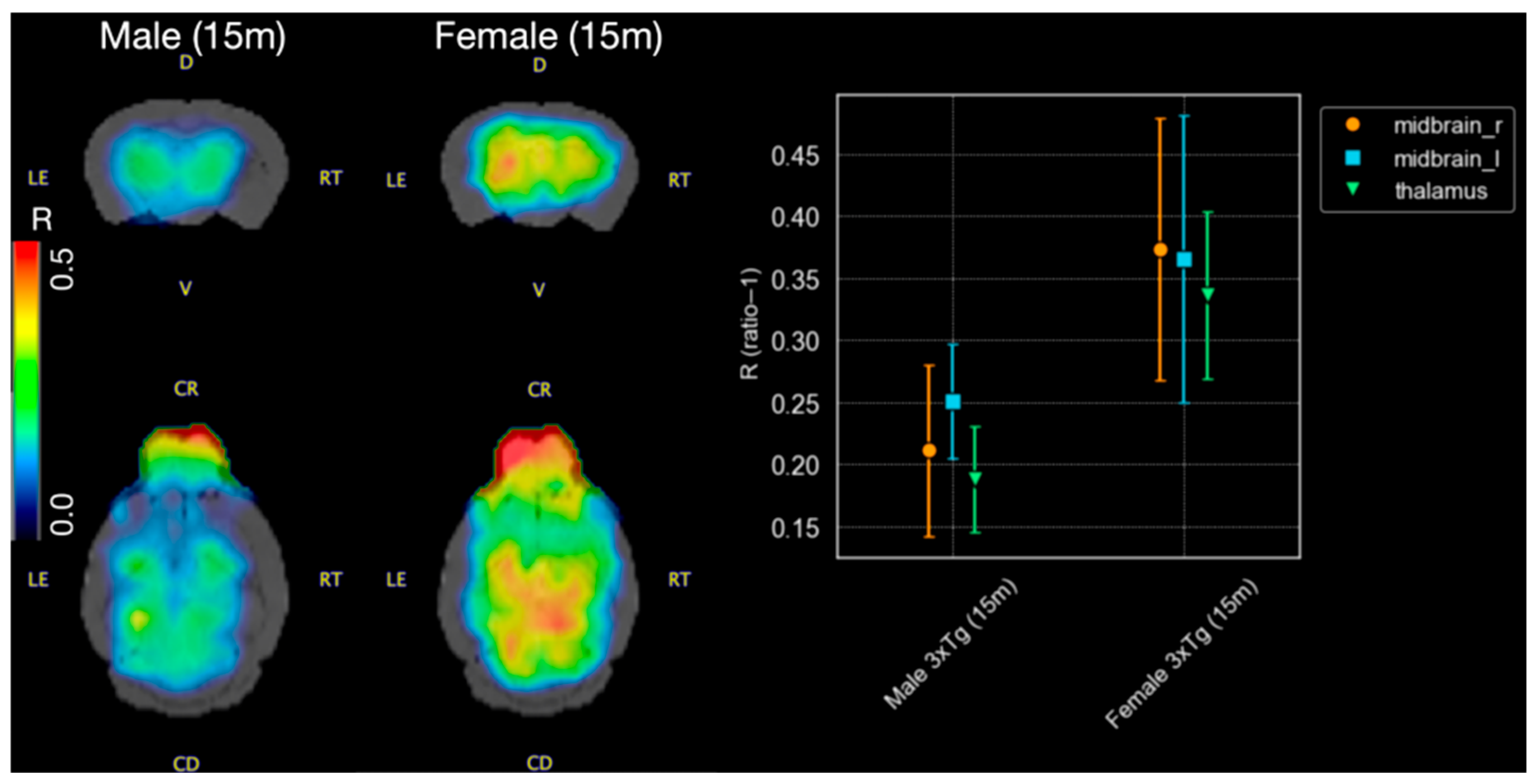 11C]PIB uptake is higher in the female mouse (right midbrain: 0.373, left midbrain: 0.365, thalamus: 0.336) compared to the male (right midbrain: 0.211, left midbrain: 0.250, thalamus: 0.188). Although the sample size is small for a formal statistical analysis, exploratory evaluation suggests that the ratio values in female 3xTg-AD mice tend to be higher (midbrain: 0.257 ± 0.132, thalamus: 0.213 ± 0.175) than those in male 3xTg-AD mice (midbrain: 0.195 ± 0.076, thalamus: 0.143 ± 0.081) across all evaluated regions.