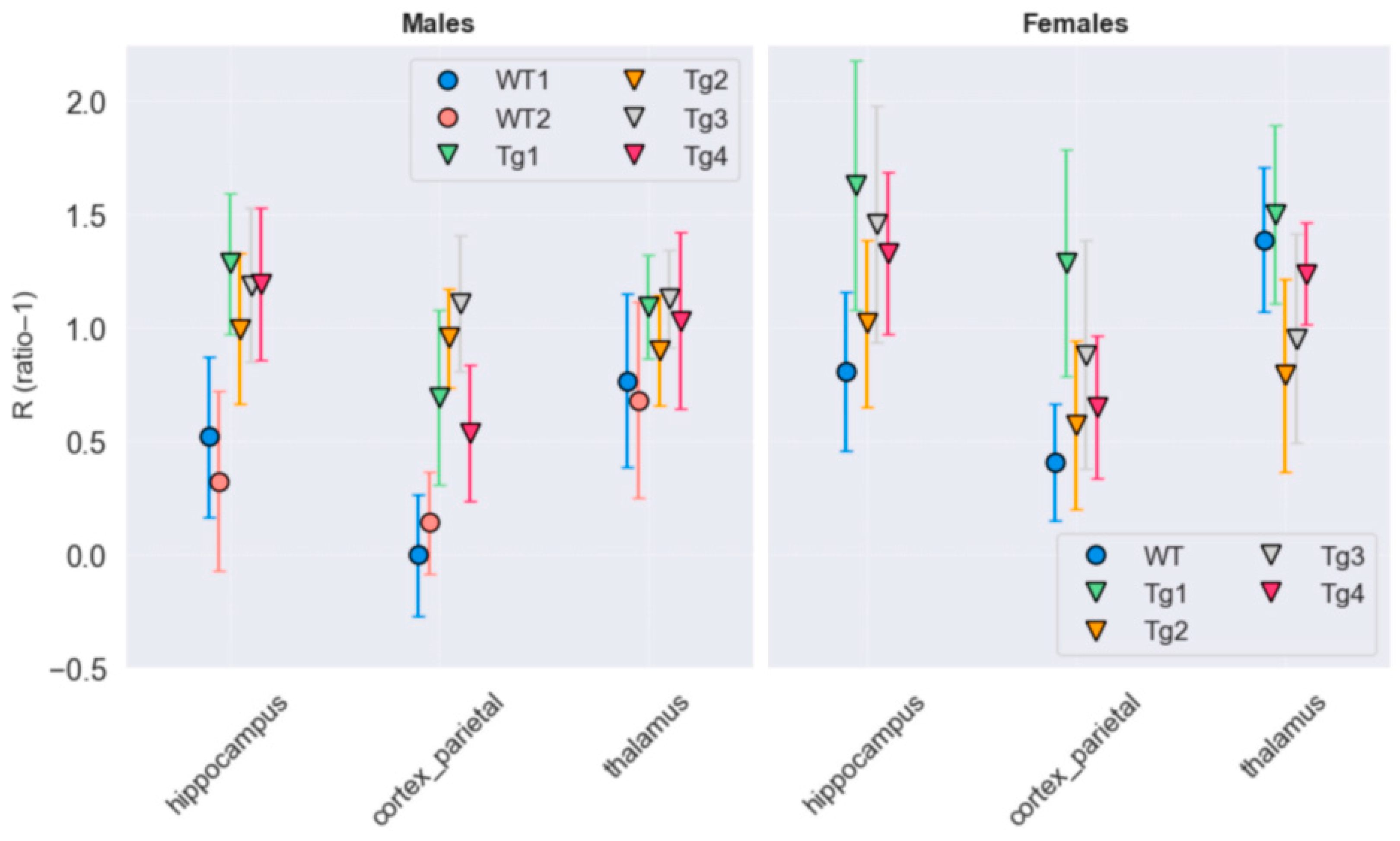 Figure 6, the highest R values were observed in the hippocampus of Tg female rats (left hippocampus = 1.31 ± 0.28, right hippocampus = 1.41 ± 0.25), representing a marked increase relative to the values obtained for the WT female rat (left hippocampus = 0.82, right hippocampus = 0.81). Values in the parietal cortex also showed differences between WT and Tg female rats (left parietal cortex: 0.89 ± 0.33, right parietal cortex: 0.81 ± 0.35 in Tg; left parietal cortex: 0.40, right parietal cortex: 0.42 in WT). No notable differences were found in thalamic values between WT and Tg female rats (left thalamus: 1.13 ± 0.36, right thalamus: 1.12 ± 0.28 in Tg; left thalamus: 1.40, right thalamus: 1.38 in WT).