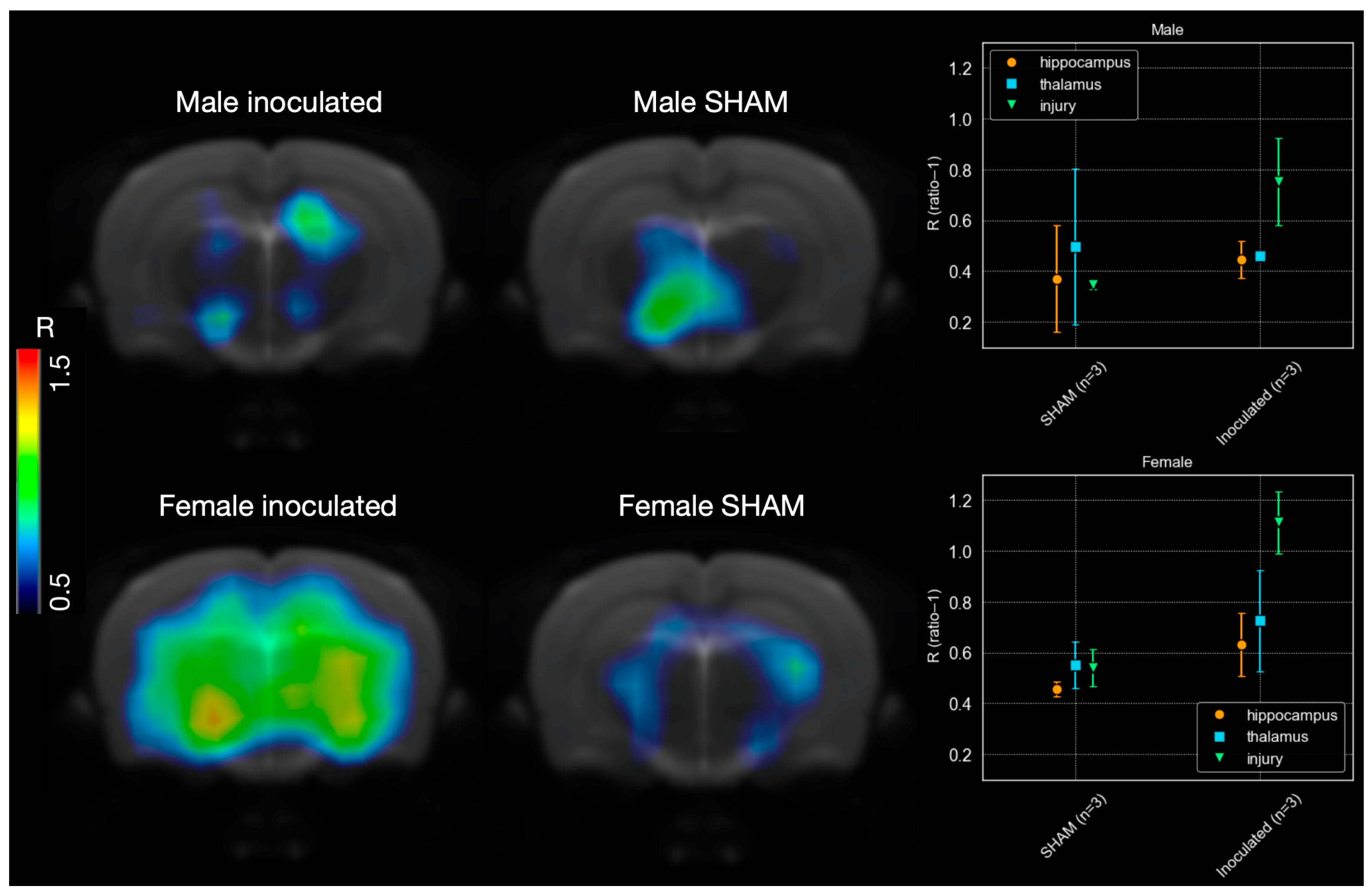 Figure 7). High values were calculated in the injury volume (R = 0.75 ± 0.17 for male, R = 1.11 ± 0.12 for female). In addition to the injury site radiotracer activity was also detected in the hippocampus (R = 0.45 ± 0.07 for male, R = 0.63 ± 0.12 for female) and thalamus (R = 0.46 ± 0.01 for male, R = 0.95 ± 0.20 for female). R values across all evaluated regions were lower for the SHAM female animals (injury site: 0.54 ± 0.07, hippocampus: 0.46 ± 0.03, thalamus: 0.55 ± 0.09). In the male rats, differences between the inoculated and SHAM animals were observed only at the injury site (injury site: 0.34 ± 0.02, hippocampus: 0.37 ± 0.21, thalamus: 0.50 ± 0.31). The inoculated female rats exhibited higher R-values in all evaluated regions than the male rats (Mann–Whitney U test,