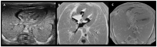 An overview was created of the cost, resolution, scanning time, and the ability to scan despite maceration for the three above-mentioned imaging techniques (Table 4). PMUS offers a relatively simple, accessible, and inexpensive way to scan fetuses. However, the resolution of the images is low and the technique is difficult to apply in miscarriages due to the small size and possible maceration of the fetus [77,79,80,82]. Both UHF-MRI and micro-CT produce relatively high-resolution images, but the resolution of micro-CT is significantly higher and the technique is less time-consuming and estimated to be more cost-effective than UHF-MRI [60,62,67,68,69,74,78,81] (Figure 2). As fetal size increases, micro-CT and UHF-MRI become less effective because of constraints such as the small bore size of UHF-MRI and the longer staining time required for micro-CT. Therefore, for fetuses beyond 20 weeks of gestation, low-field MRI is considered more appropriate (Figure 3) [67].