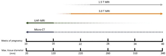 Applicability of different imaging techniques per fetal age. For fetuses younger than 16 weeks of gestation, micro-CT and UHF-MRI appear to be the most suitable modalities [67].