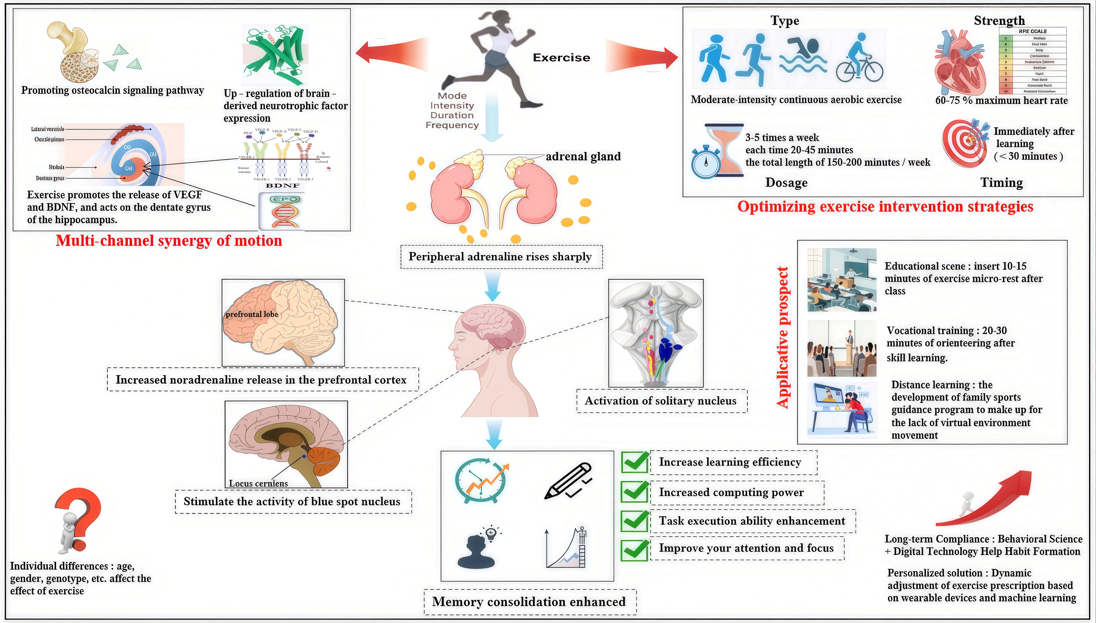 Based on current evidence, optimizing exercise intervention strategies requires precise consideration of three key dimensions: exercise type, dose, and timing, to maximize its promoting effect on memory consolidation. Regarding exercise type, moderate-intensity continuous aerobic exercise, such as brisk walking, jogging, swimming, and cycling, shows the most consistent beneficial effects, as it effectively elevates epinephrine levels, promotes osteocalcin release, and induces neurogenesis simultaneously [40]. Although high-intensity interval training can also significantly elevate epinephrine, its promoting effects on BDNF and neurogenesis are relatively weaker, and it may cause excessive fatigue affecting subsequent cognitive function due to its high intensity [41]. While resistance training benefits musculoskeletal health, its effects on improving hippocampal function and memory are less pronounced than aerobic exercise, suggesting it should be used as an adjunct rather than the primary intervention method [42]. Regarding dose, based on meta-analysis evidence, performing moderate-intensity aerobic exercise 3–5 times per week, for 20–45 min per session, which accumulates 150–200 min weekly, is recommended, as this dose produces significant and sustainable cognitive benefits [43]. Exercise intensity should be controlled at 60–75% of maximum heart rate or at a subjective level of “somewhat hard but still able to talk,” a range that optimizes epinephrine release without causing excessive stress responses [44]. Most crucially, timing selection exercise should be performed immediately after learning concludes, ideally within 30 min to precisely match the sensitive time window for memory consolidation [45]. Studies find that subjects performing 30 min of moderate-intensity aerobic exercise immediately after learning had a 10–15% higher memory retention rate after 48 h compared to delayed exercise groups or sedentary control groups [46]. This timing-specific effect is closely related to the epinephrine “increment effect” and the temporal coupling between exercise-induced molecular events, such as BDNF and osteocalcin release, and the memory consolidation process. Therefore, an optimized exercise intervention plan should be an integrated strategy based on aerobic exercise type, moderate-intensity dose, and immediate post-learning implementation.