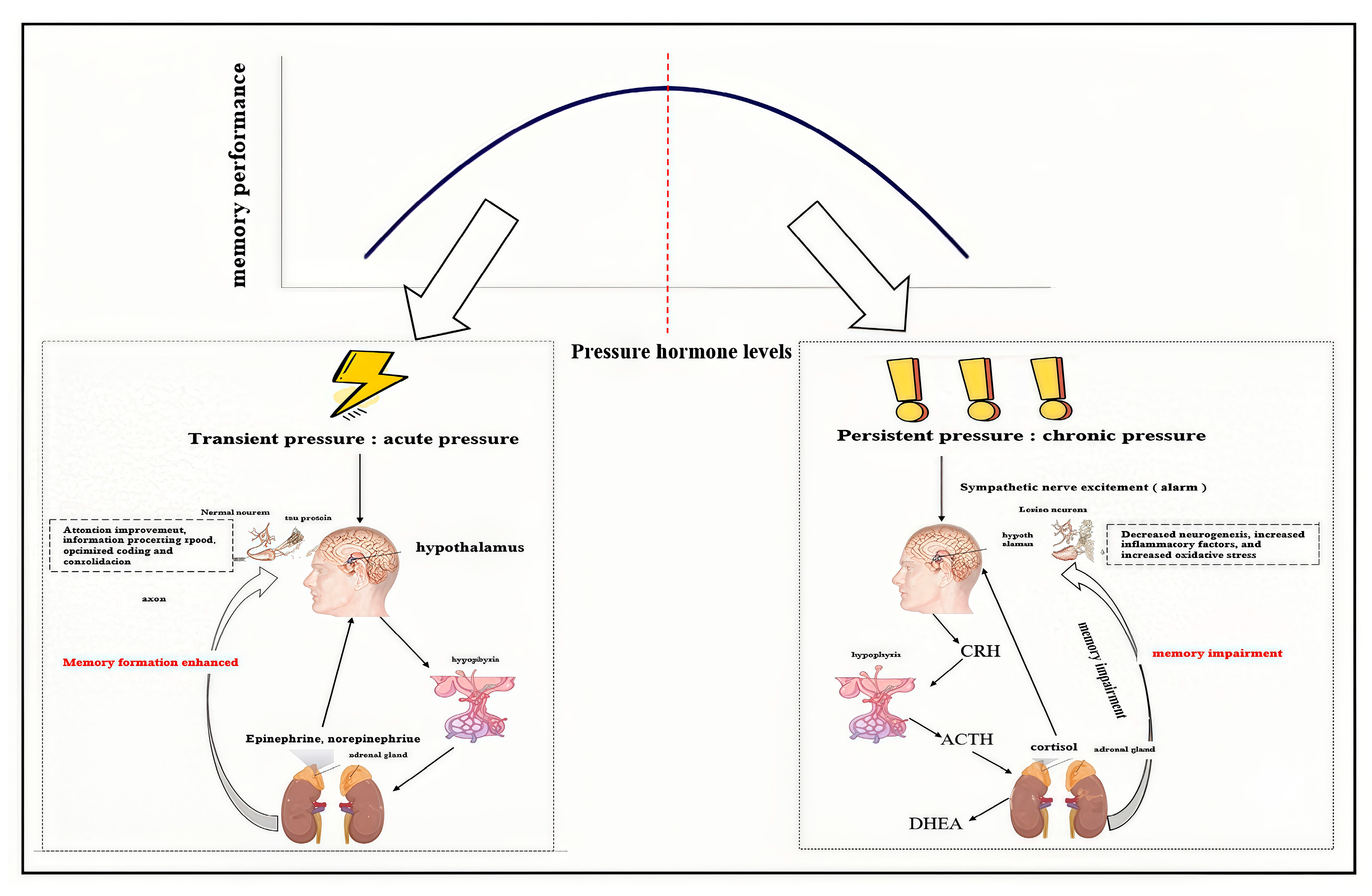 Moderate acute elevation of epinephrine induces a state of “neurochemical acute stress.” This transient stress response significantly enhances memory formation by increasing attention, alertness, and information processing efficiency. However, chronic or excessive stress exerts inhibitory effects on the hippocampus through sustained high levels of cortisol and epinephrine, highlighting the critical importance of “acute” and “moderate” characteristics in stress-related memory modulation. Under acute stress, the rapid release of epinephrine and noradrenaline activates the locus coeruleus–noradrenergic system, enhancing neural activity in the prefrontal cortex and hippocampus, and optimizing the encoding and consolidation of information related to environmental threats [16]. This effect conforms to the classic “inverted U-shaped” dose–response curve, where moderate levels of stress hormones enhance memory, while very high or very low levels impair it. From an evolutionary perspective, the acute stress response prioritizes the processing of survival-relevant information, thereby promoting adaptive behavior [17]. In contrast, chronic stress leads to persistently elevated glucocorticoids, such as cortisol, causing dendritic atrophy of hippocampal neurons, reduction in synaptic connections, and inhibition of neurogenesis, ultimately impairing memory function and cognitive flexibility [18]. Studies also indicate that chronic stress exacerbates neurodegenerative changes in the hippocampus by promoting the release of pro-inflammatory cytokines and oxidative stress [19]. Therefore, the temporal dynamics and concentration levels of epinephrine are key factors determining whether it enhances or inhibits memory. Only a moderate, short-lived surge maximizes memory benefits, whereas prolonged activation leads to maladaptation and cognitive impairment, see Figure 1.