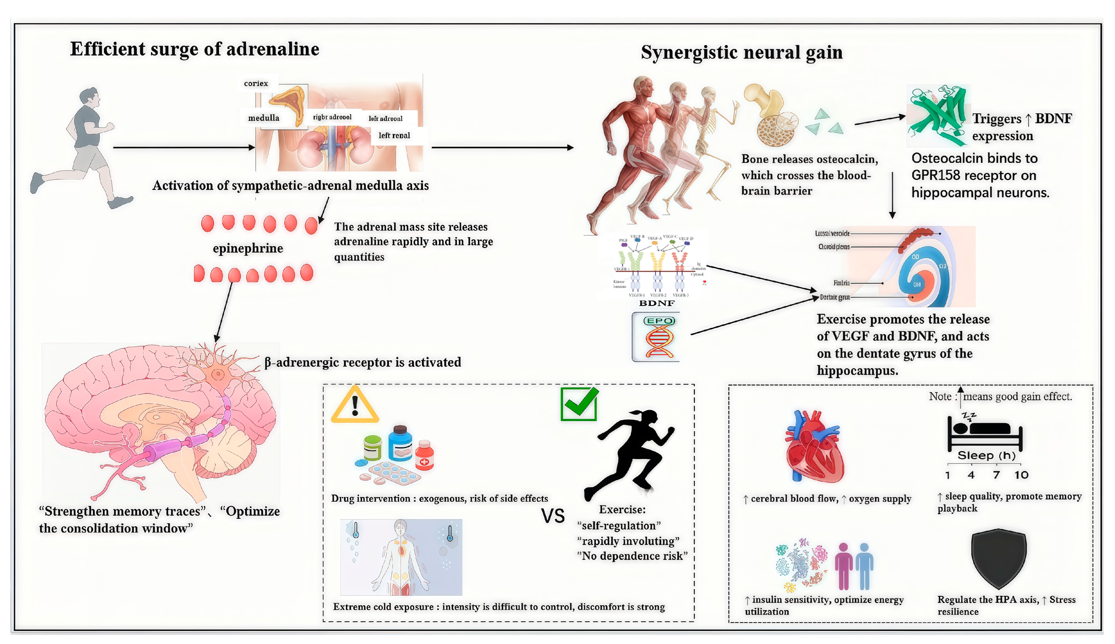 Figure 2. Double advantages of exercise in enhancing learning and memory: acute epinephrine surge and multi-channel synergistic neural gain. This figure shows how exercise, as an ideal intervention strategy, enhances the memory effect after learning through the’ dual advantage’ mechanism. (left) Advantage one: safe, rapid, and controllable induction of acute epinephrine release, accurate matching of memory consolidation time window. (Right) Advantage 2: Beyond epinephrine, it has broad and lasting benefits to the brain through multiple pathways, such as osteocalcin signaling, promoting neurogenesis, and system optimization. Original integrative diagram illustrating the dual advantages of exercise in enhancing memory consolidation.