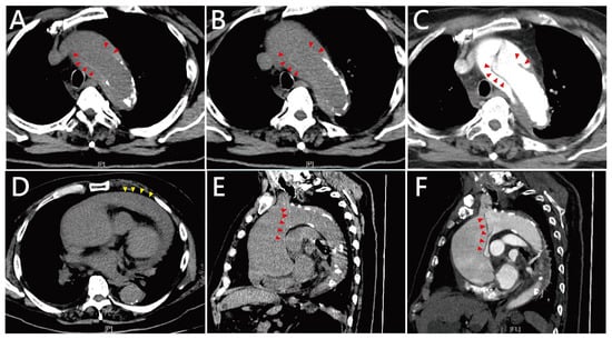 Computed tomography (CT) findings of Stanford type A aortic dissection in this patient. (A,B) Axial non-contrast CT images at different levels of the ascending aorta demonstrate marked aortic dilatation and an obvious intimal flap (red arrowheads) with associated high-attenuation density, consistent with acute dissection. Hounsfield unit (HU) values of both the suspected inner membrane (HU up to 70–80). (C) The presence of the intimal flap is further confirmed by contrast-enhanced CT angiography (red arrowheads). (D) An axial CT slice reveals massive fluid accumulation in the pericardial space (yellow arrowheads), compatible with hemopericardium. (E,F) Sagittal reconstructions from both non-contrast CT (E) and contrast-enhanced CT angiography (F) show the extent of ascending aortic dilation and the eccentric intimal flap (red arrowheads) coursing along the aortic wall.