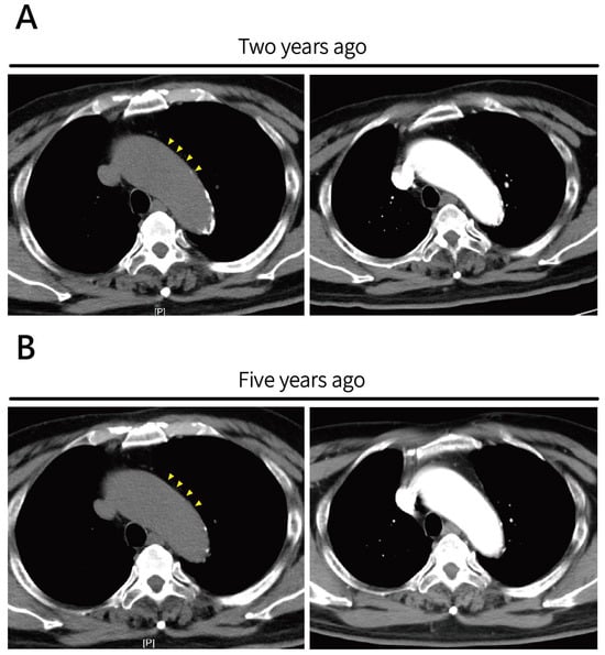 Prior surveillance axial non-contrast CT images and CTA images for ascending aortic aneurysm. (A) Image obtained two years prior and (B) five years prior demonstrate progressive ascending aortic dilatation over time. No obvious high-attenuation calcification intimal flap or signs of acute aortic pathology were noted at either time point. Retrospective review revealed mild dilatation at the aortic root (yellow arrowheads).