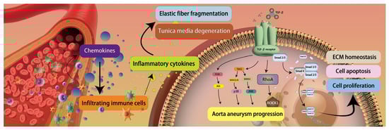 Aortic dissection pathogenesis. Injured vascular smooth muscle cells secrete chemokines, promoting inflammatory cell infiltration into the aortic wall, including T lymphocytes and monocytes. Activated dendritic cells release chemotactic mediators that recruit macrophages and CD4+ T cells. These immune cells secrete proinflammatory cytokines, resulting in elastic fiber fragmentation and medial degeneration. Imbalance between proteases and their inhibitors enhances proteolytic activity, impairing extracellular matrix remodeling. The TGF-β signaling pathway regulates cell proliferation, apoptosis, and matrix homeostasis through the Smad2/3-Smad4 complex, while its noncanonical pathways (ROCK and MAPK) also participate in aortic aneurysm progression and dissection pathogenesis, ultimately leading to structural deterioration of the aortic wall. (Figure 3 is an original schematic based on published literature).