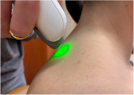 All myotonometric measurements were performed in the sitting position, with participants seated on a standardized chair, hips and knees flexed at approximately 90°, feet resting flat on the floor, and upper limbs in a neutral relaxed position alongside the body [15]. The sitting position was selected because it assures stability and reduces variability associated with gravitational effects in standing or supine positions. Measurement sites were identified by palpation using anatomical landmarks and labelled before data collection. The probe was placed perpendicular to the skin surface at the predetermined location during both the first and last assessments. For deltoid muscle, the probe of the MyotonPro was positioned at the mid-belly of the deltoid, approximately halfway between the lateral border of the acromion and the insertion on the deltoid tuberosity of the humerus (Figure 1), with the arm resting neutrally [16]. Upper trapezius was assessed at the midpoint between the spinous process of C7 and the lateral tip of the acromion, corresponding to the thickest portion of the muscle belly (Figure 2), and pectoralis major muscle was measured at the sternal portion, in the middle distance between the lateral border of the sternum and the humeral insertion, with the arm relaxed along the trunk [17].