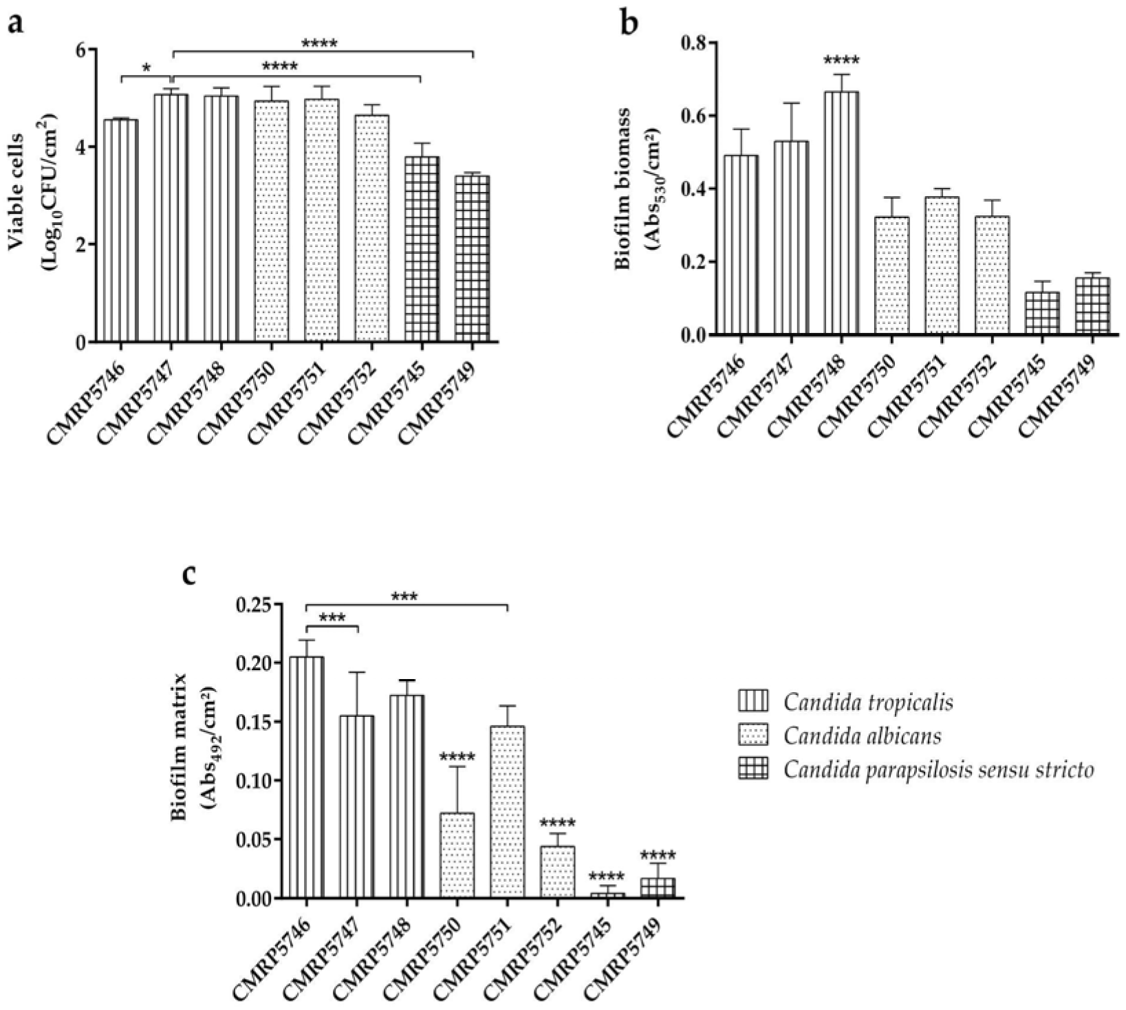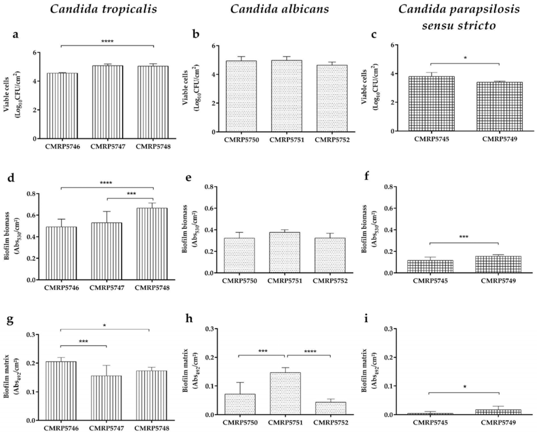 - Costa, C.R.; Marreto, L.C.N.; Rocha, V.L.; da Silva, T.C.; do Rosário Rodrigues Silva, M. Biofilm forming capability and antifungal susceptibility profile of Candida spp. From blood. Rev. Patol. Trop. 2018, 47, 11–18. [Google Scholar] [CrossRef]