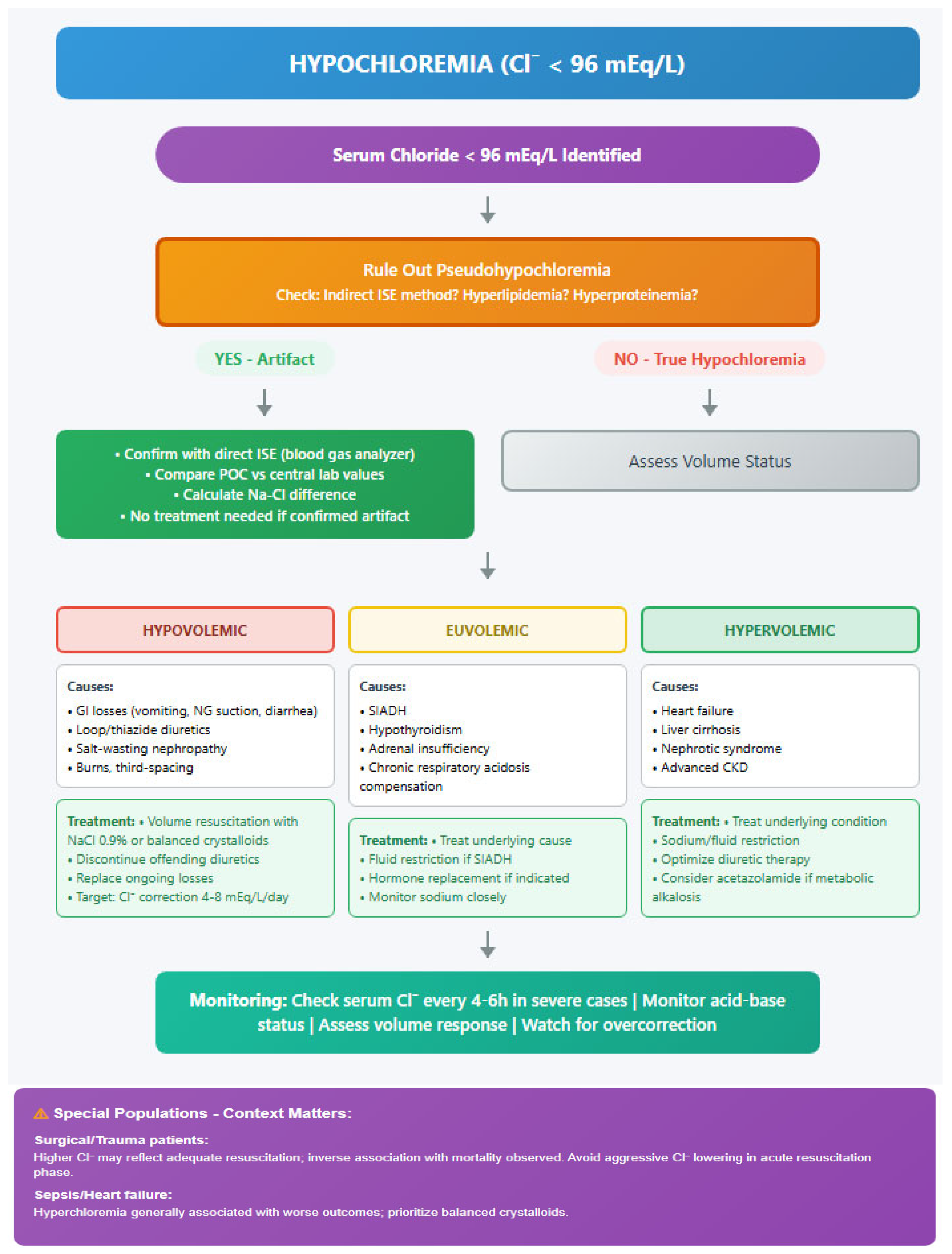 41]. When pseudohypochloremia is suspected, treatment decisions should be based on direct ISE measurements or deferred until the true chloride status is clarified, thereby avoiding potentially harmful interventions [