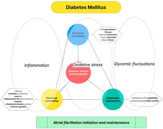 Although the association between AF and DM is well established, the underlying pathophysiological pathways remain only partially clarified, reflecting a multifaceted interplay of metabolic, structural, and electrophysiological alterations driven by DM. Chronic hyperglycemia, insulin resistance, and systemic inflammation contribute to cardiac remodeling, fibrosis, autonomic imbalance and others—all of which create a substrate conducive to AF initiation and maintenance [8].