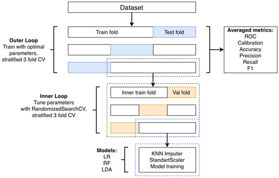Model Validation and Hyperparameters Optimization. Stratified nested cross-validation was employed to provide an unbiased estimate of the models’ performance and prevent data leakage from the hyperparameter tuning process. A flowchart demonstrating a pipeline for data processing, model training, and validation is shown in Figure 1.