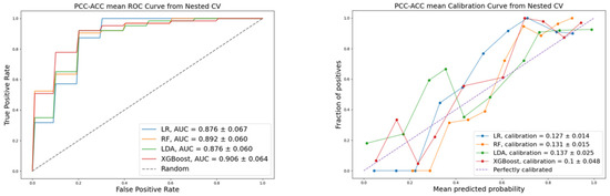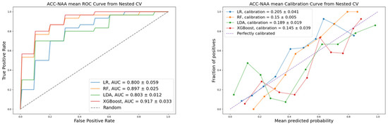 To compare the performance of ML algorithms used in this work, we calculated the following quality metrics: accuracy, precision, recall, F1-score, calibration, and discrimination. Stratified cross-validation was applied to improve the objectivity of the classification quality assessment. Visualization of the ROC and calibration for the evaluated models are presented in Figure 2, Figure 3 and Figure 4, corresponding to each pair of the three diagnoses: PCC, ACC, and NAA.