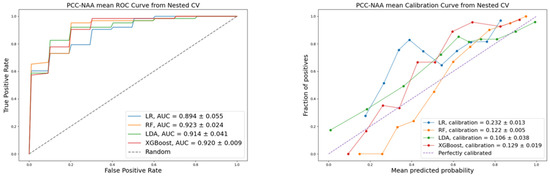 For the PCC vs. NAA classification, the LDA model showed the best accuracy (0.8817 ± 0.0402), precision (0.8836 ± 0.0383), recall (0.8817 ± 0.0402), F1-score (0.8823 ± 0.0396), and Brier score (0.1060 ± 0.0380). The RF model, however, achieved the highest discriminative power with an AUC of 0.9230 ± 0.0243.