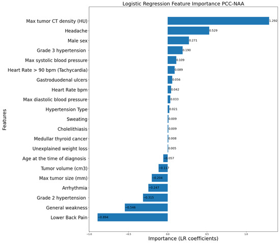 One of the key objectives was to identify clinical features that can be used for differentiating PCC from ACC and NAA. To rank the features of the standardized data by their importance for classification, we used the Logistic Regression coefficients due to the model’s interpretability. We used stratified nested cross-validation with 10 outer folds and 5 inner folds for a more accurate estimation of the expected value of the coefficients. The feature importance values were averaged across the outer cross-validation folds.