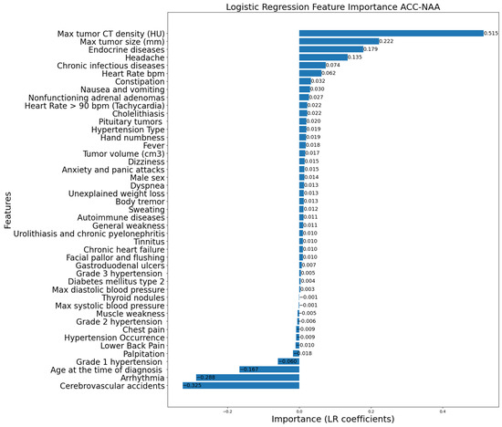 According to the statistical analysis of clinical data (Table 2, Table 3 and Table 4), significant features distinguishing PCC from ACC and NAA were headache, lower back pain, palpitations, general weakness, maximum blood pressure, adrenal tumor volume and size, and tumor CT density. The LR coefficients were largely consistent with the statistical analysis, while highlighting key distinctions for each paired diagnosis. Overall, the LR model confirmed the importance of specific characteristics in differentiating these adrenal lesions.