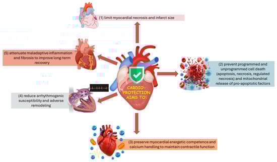 Cardioprotection refers to the ensemble of endogenous adaptive responses and exogenous interventions that reduce myocardial injury and preserve cardiac structure and function in the face of acute or chronic stressors, most notably ischemia/reperfusion (I/R), as well as pharmacologic cardiotoxins and surgical insults. Over the past decades, the field has adopted outcome-oriented definitions in which the success of a cardioprotective maneuver is judged by reductions in tissue necrosis and cell death, preservation of contractile performance and electrical stability, and mitigation of adverse remodeling. These outcomes have been operationalized in preclinical and clinical studies as infarct size, biochemical biomarkers of myocyte injury, imaging-derived salvage and functional parameters, and clinical endpoints, including heart failure and death [30,31,32,33].