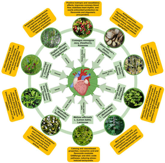 In this section, we synthesize evidence for ten medicinal plant species with long-standing cardiovascular use that are also supported by reproducible experimental findings and, where available, human data. Rather than providing exhaustive monographs, we emphasize mechanistic interpretation and translational readiness by summarizing (i) the dominant phytochemical classes and standardized preparations, (ii) the convergent cardioprotective pathways mapped to the conserved nodes discussed above (e.g., redox/inflammatory control, endothelial function, and mitochondrial stability), and (iii) key limitations affecting clinical reproducibility, including extract variability, bioavailability, and safety in polypharmacy contexts.