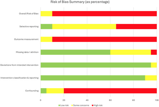- Sterne, J.A.C.; Hernán, M.A.; Reeves, B.C.; Savović, J.; Berkman, N.D.; Viswanathan, M.; Henry, D.; Altman, D.G.; Ansari, M.T.; Boutron, I.; et al. ROBINS-I: A tool for assessing risk of bias in non-randomised studies of interventions. BMJ 2016, 355, i4919. [Google Scholar] [CrossRef] [PubMed]