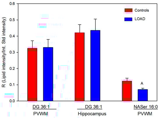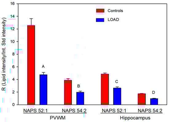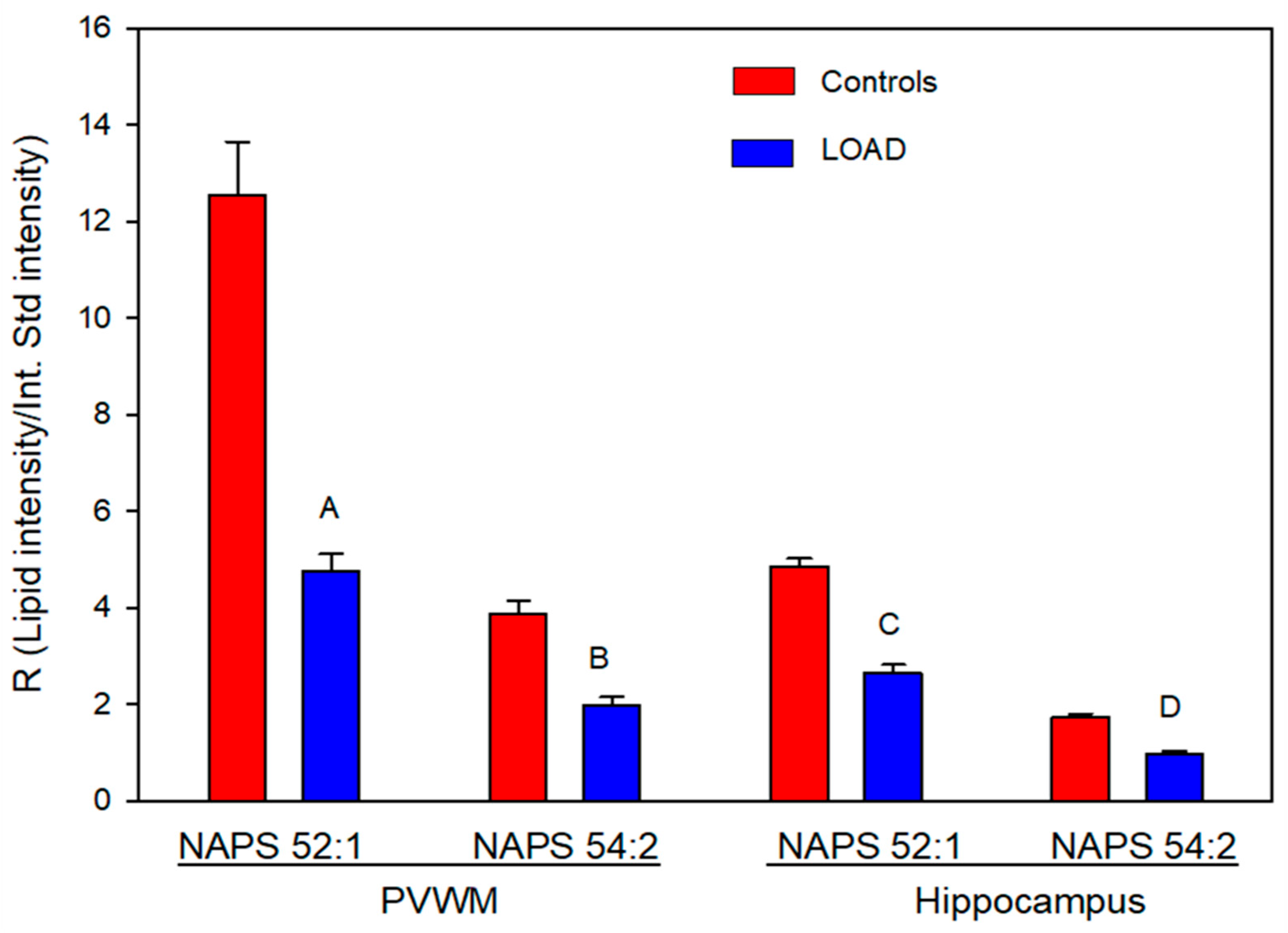 NAPS 52:1 was the dominant NAPS in both the hippocampus and the PVWM, as reported previously for the human frontal cortex [16,25] and the mouse brain [29]. Levels of NAPS 52:1 were approximately three times greater than those of NAPS 54:2, with the levels of both NAPSs in LOAD tissues found to be about 50% of that in controls (Figure 1). The PVWM contained the highest relative levels of NAPS 52:1. This was approximately 2.5 times the levels present in hippocampal tissue (Figure 1).