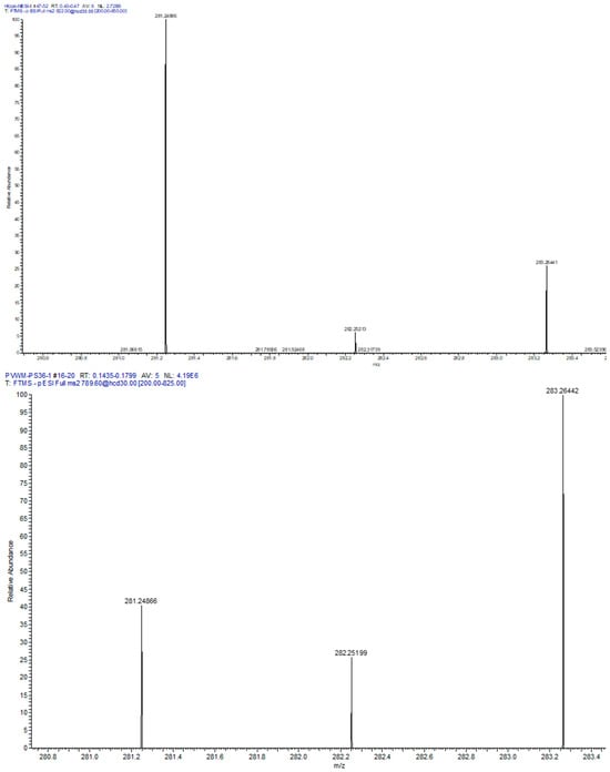 MS2 of PVWM NAPS 52:1 (PS 18:0/18:1;N 16:0). FA 18:0 (283.2646; 1.22 ppm), FA 18:1 (281.2488; 0.69 ppm), and inserts of FA 16:0 (255.2333; 1.37 ppm) and phosphatidic acid 36:1 (18:0/18:1 = (701.5137; 1.46 ppm). These data support the structure of NAPS 52:1 as N-16:0-PS 18:0/18:1, as previously reported for the human frontal cortex [16] and mouse brain [29].