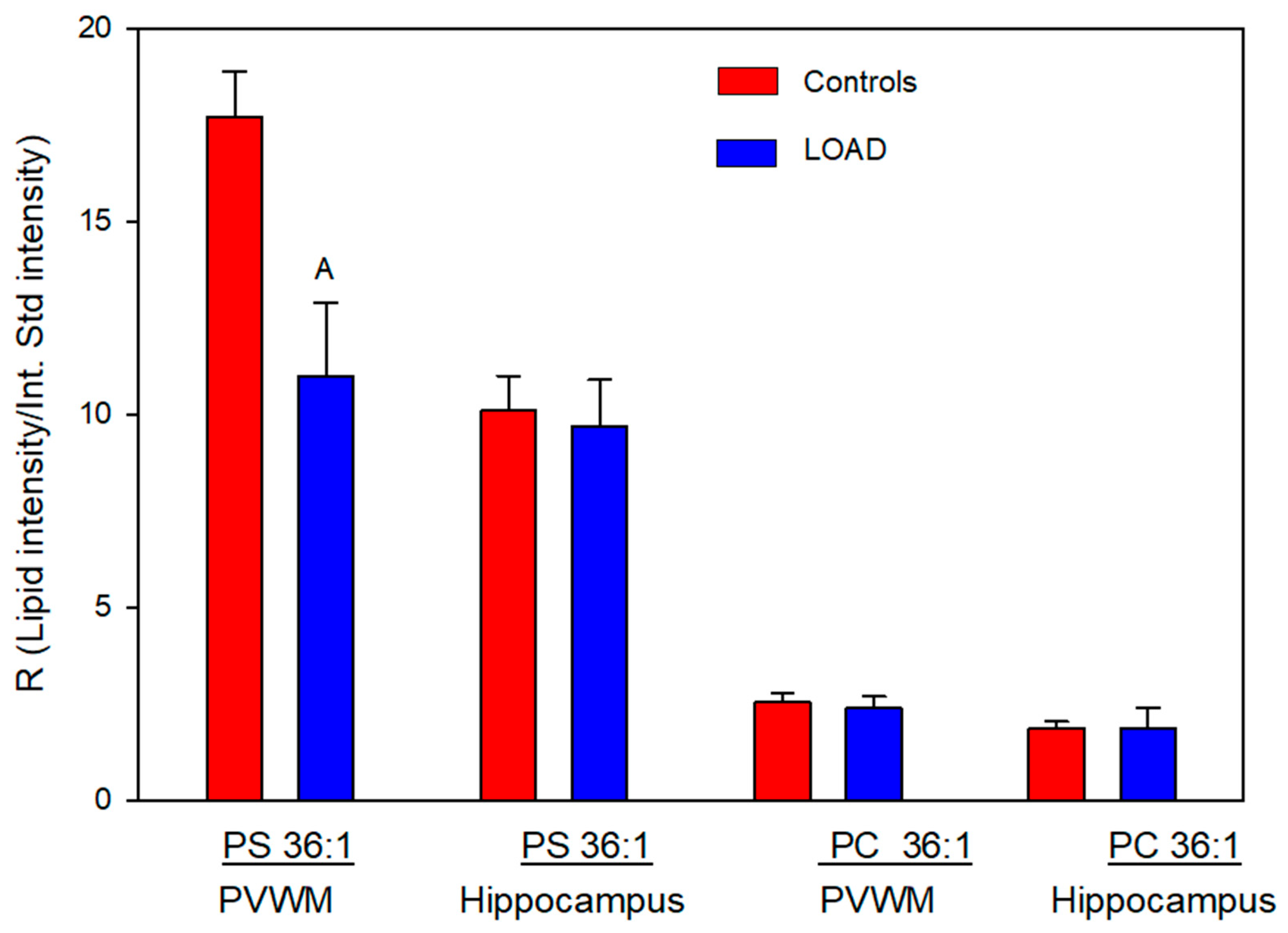 Relative levels of phosphatidylserine (PS) 36:1 and phosphatidylcholine (PC) 36:1 in the PVWM and hippocampus of controls and subjects with LOAD. A (p = 0.013). N = 8 per group.