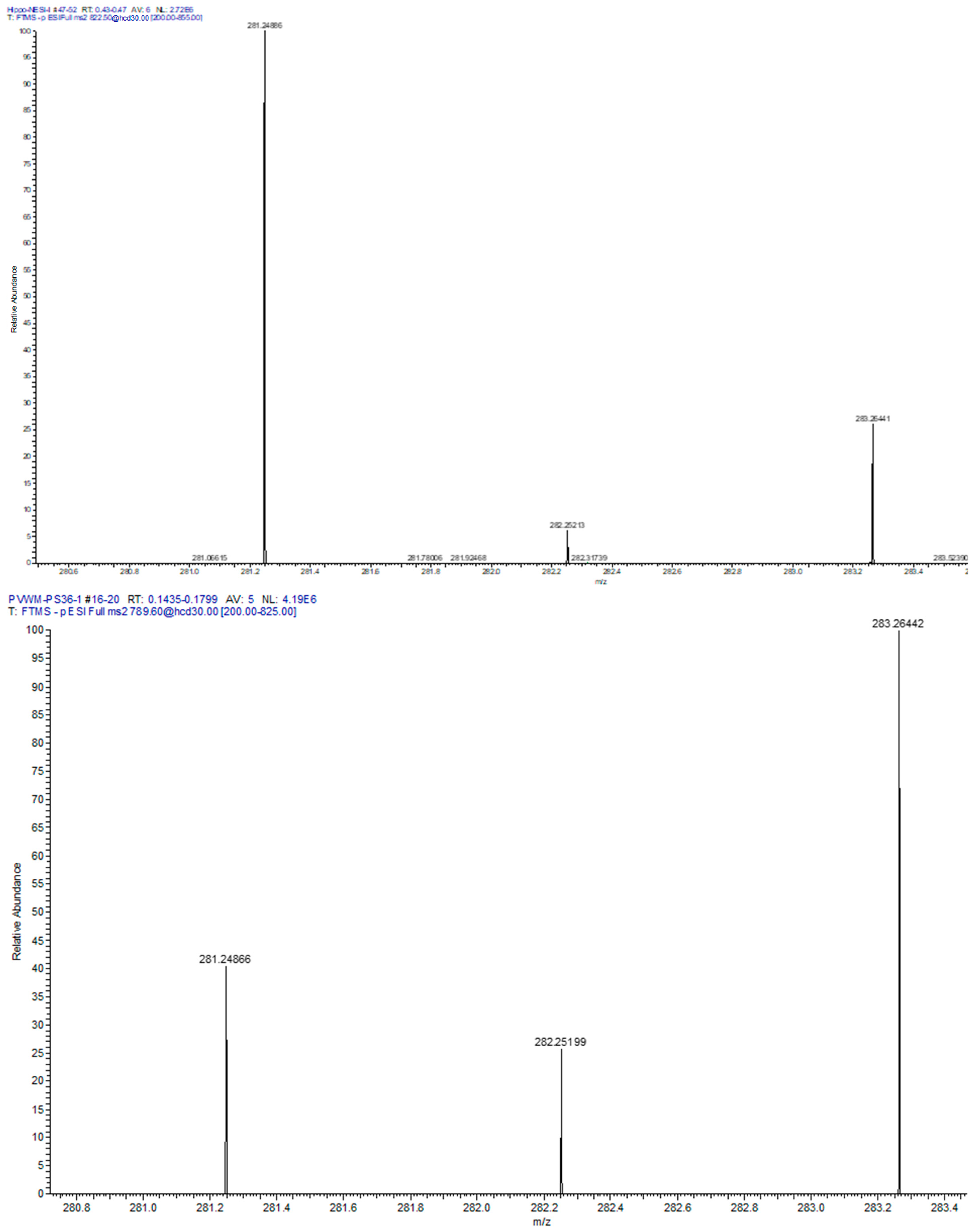 MS2 validation of NAPS structures involved analysis of the product ions of precursor ions selected with a 0.4 amu window and collision energies of 25 arbitrary units. Product ions were monitored with a resolution of 140,000 (<2 ppm mass error). These included ions for the fatty acids of the phosphatidylserine (PS) and the N-acyl fatty acid, along with the phosphatidic acid of the PS [16].