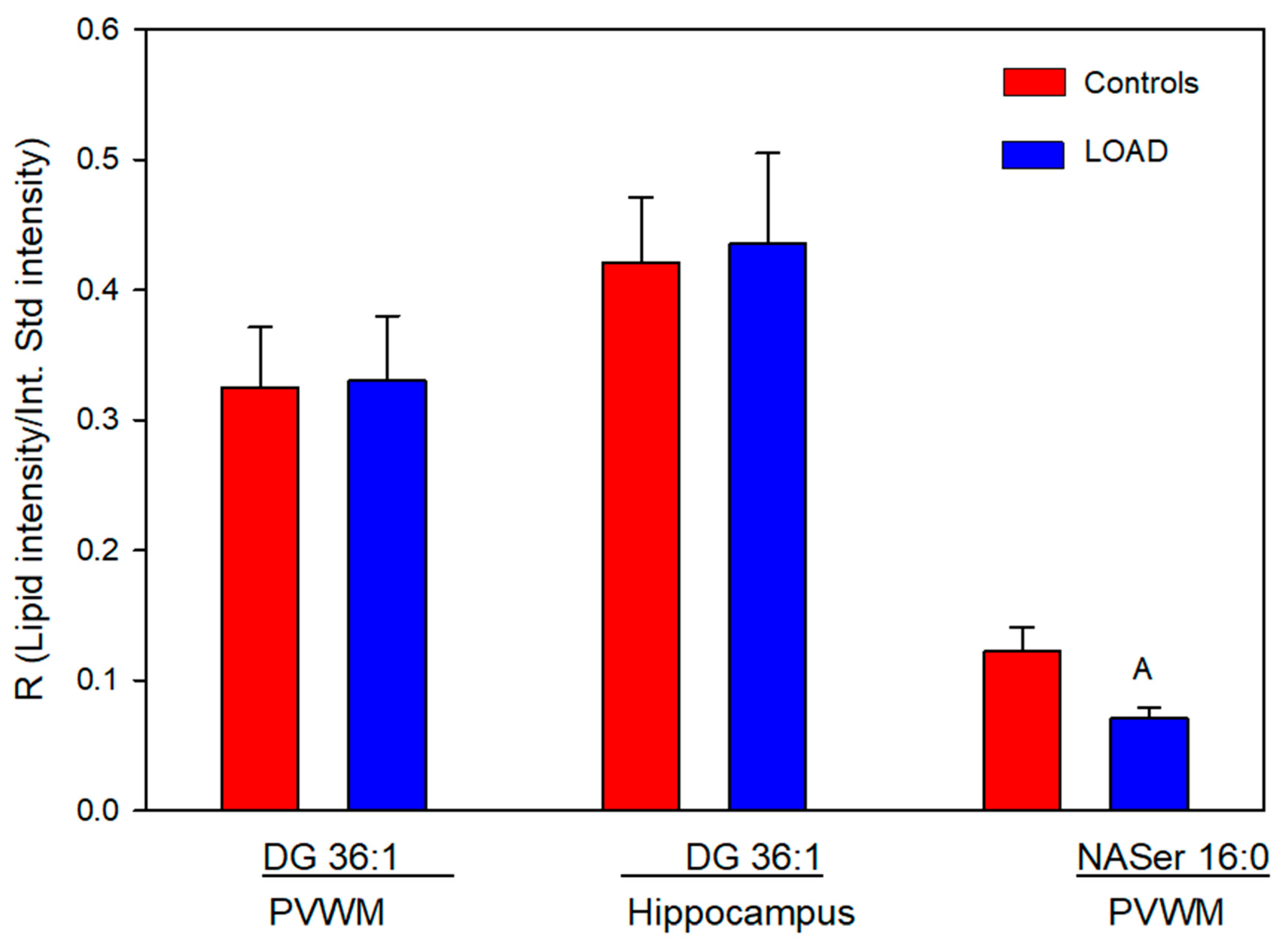 The N-acyl amino acids NASer 16:0 and 18:1, phospholipase D metabolic products of NAPS, were monitored at trace levels, and only NASer 16:0 was reliably measured in the PVWM. In this case relative levels were decreased by 40% in subjects with LOAD (Figure 5).