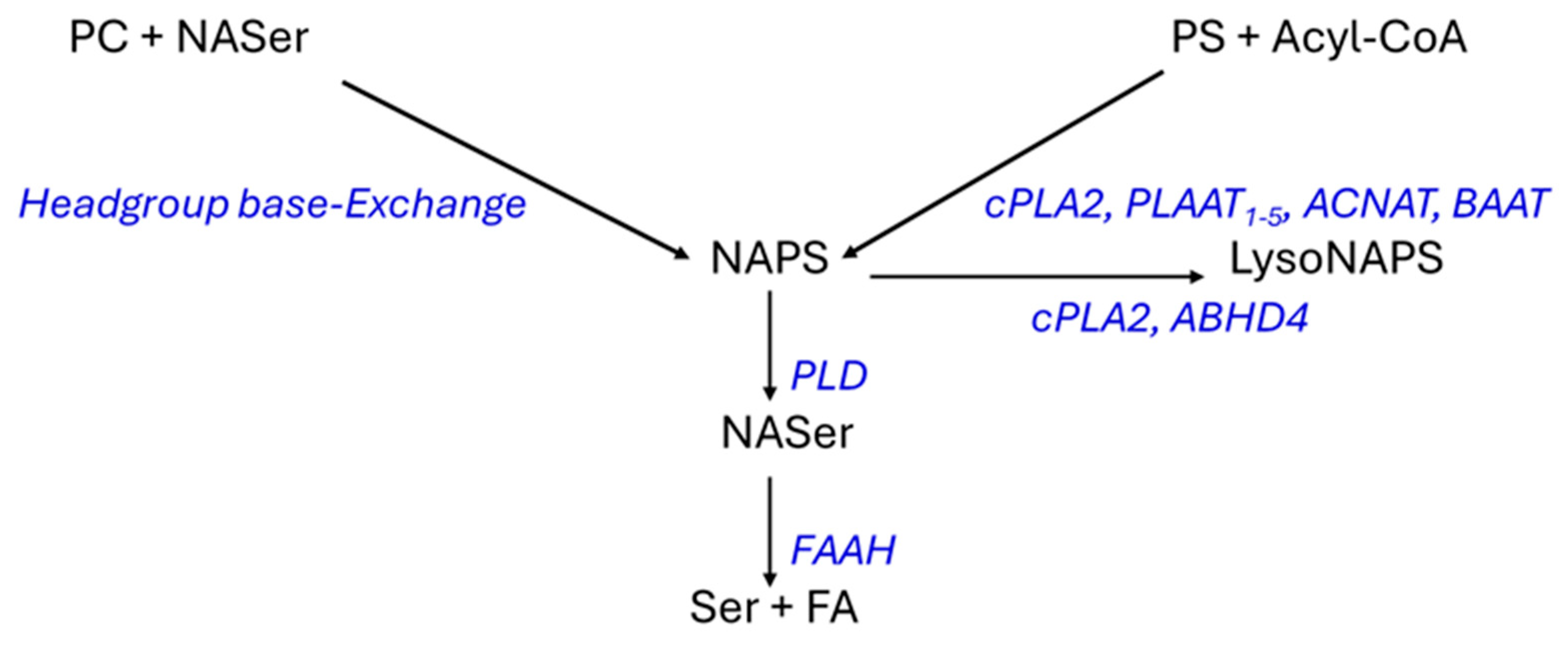The biosynthetic pathways for NAPS require more validation (Figure 6) since the conjectured pathways are based solely on the more extensive research into the biosynthetic pathways for N-acylphosphatidylethanolamines (NAPEs). Direct N-acylation of phosphatidylserines can involve cytosolic Ca++-dependent phospholipase 2/N-acyltransferase (cPLA2); phospholipase A and acyltransferase (PLAAT); acyl-CoA:amino acid N-acyltransferases (ACNAT); and bile acid-CoA:amino acid N-acyltransferase (BAAT) as has been demonstrated for N-acylphosphatidylethanolamines and other amino acids in peroxisomes [38] and in the cytosol [36,37,39,40]. The PLAAT family are calcium-independent N-acyltrasferases that are critical in the homeostasis of membrane function in mitochondria, lysosomes, peroxisomes, and the endoplasmic reticulum [37,41].