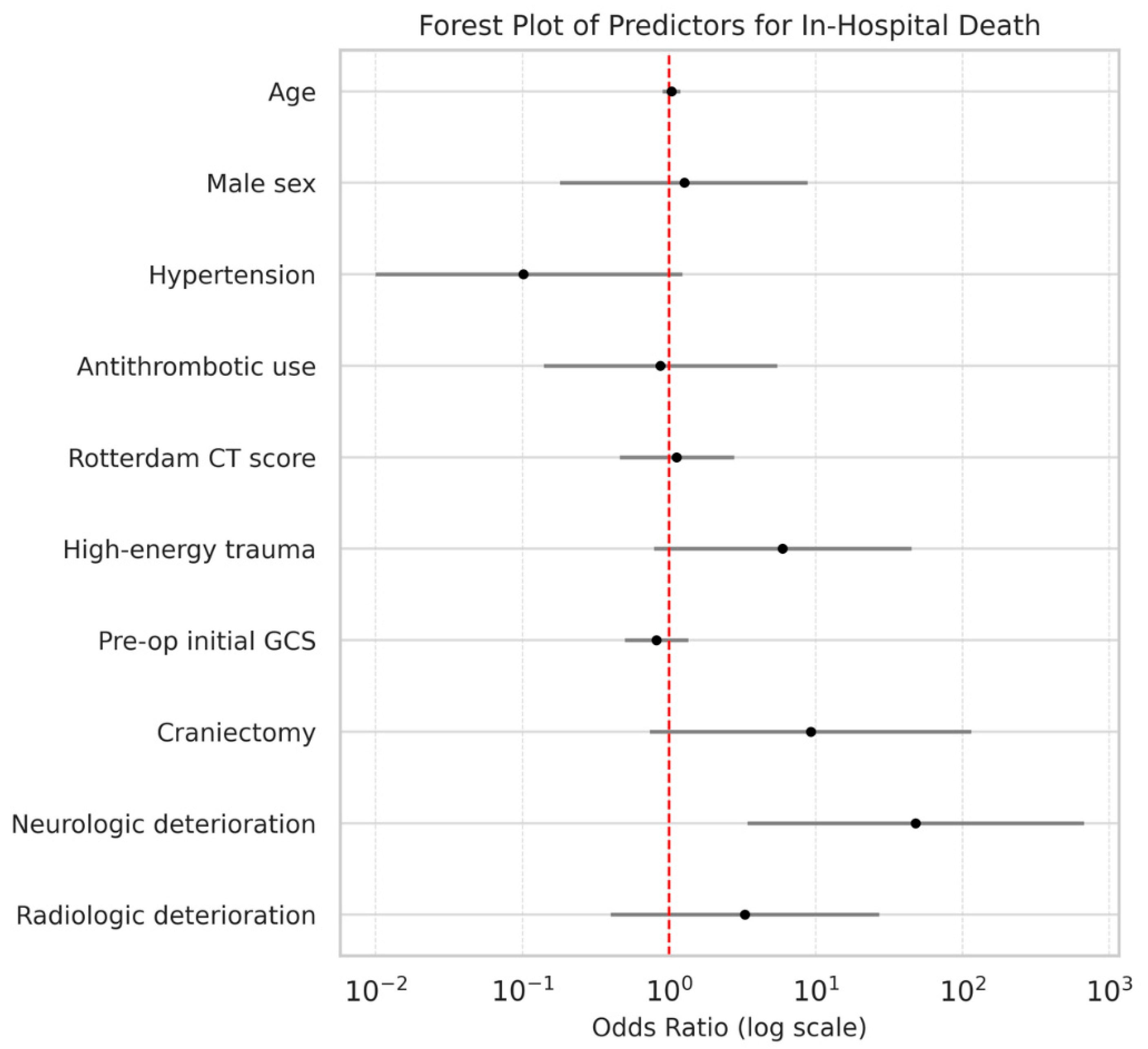 | Craniectomy | 2.22 | 9.2 (0.7–115.0) | 0.084 | |