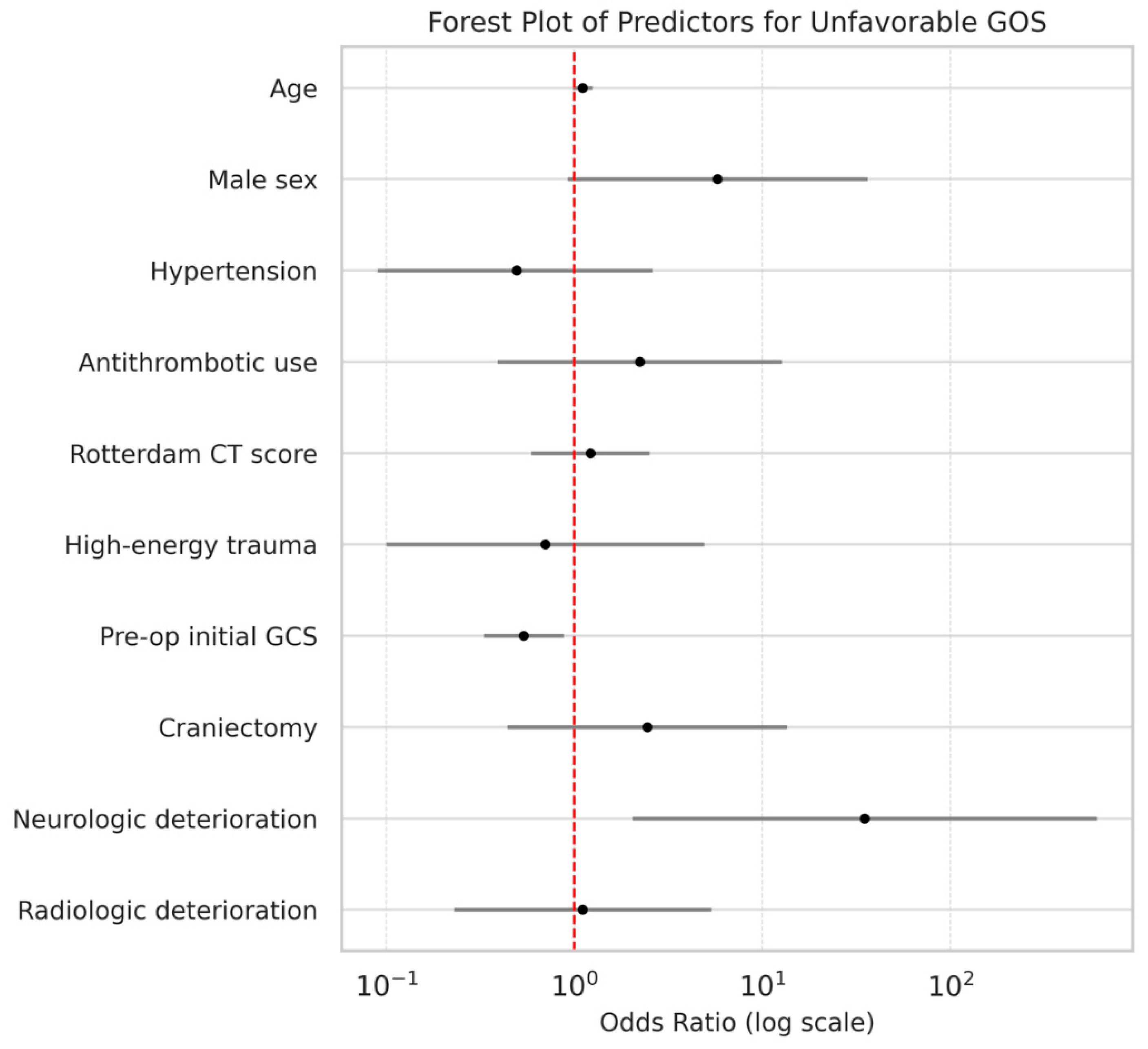 | Preoperative initial GCS | −0.20 | 0.8 (0.5–1.4) | 0.434 | |