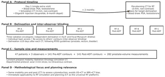 Given the inclusion of 47 patients and the participation of three observers per patient, a total of 141 pre-ADT and 141 post-ADT prostate contours were obtained, yielding 282 volumetric measurements. The study workflow is summarized in Figure 1.
