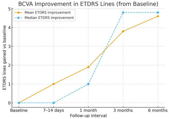 The mean baseline BCVA was 0.99 ± 0.21 logMAR (Snellen equivalent ≈ 20/180). By 7–14 days, the mean BCVA improved to 0.89 ± 0.20 logMAR (≈20/155), representing an early gain of approximately one ETDRS line. At 1 month, the mean BCVA improved further to 0.80 ± 0.20 logMAR (≈20/110), corresponding to an average gain of two ETDRS lines. At 3 months, the mean BCVA reached 0.60 ± 0.18 logMAR (≈20/80), and by 6 months, it improved to 0.53 ± 0.20 logMAR (≈20/70); p < 0.05 for overall change, with six eyes (60%) gaining four or more ETDRS lines and none lost vision. Mean and median ETDRS line gains are shown in Figure 2, and BCVA changes over time are detailed in Table 2.